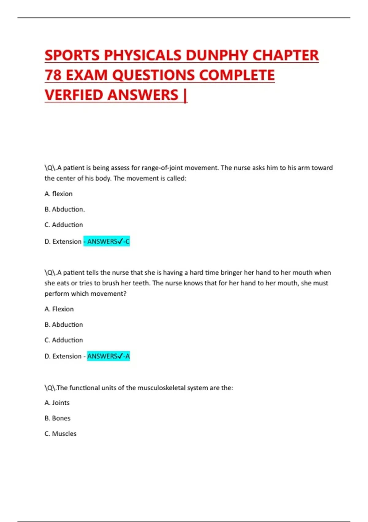 SPORTS PHYSICALS DUNPHY CHAPTER 78 EXAM QUESTIONS COMPLETE VERFIED ANSWERS |