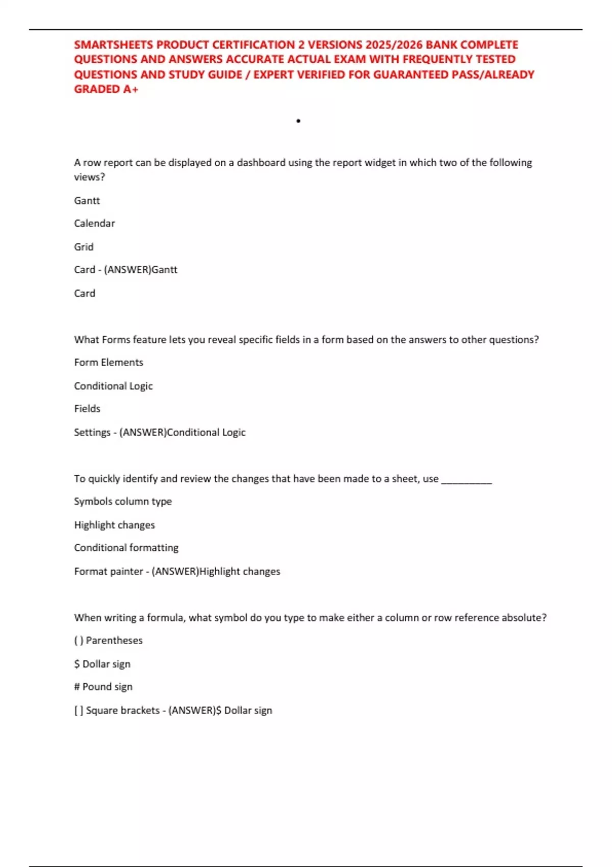 SMARTSHEETS PRODUCT CERTIFICATION 2 VERSIONS 2025/2026 BANK COMPLETE QUESTIONS AND ANSWERS ACCURATE ACTUAL EXAM WITH FREQUENTLY TESTED QUESTIONS AND STUDY GUIDE / EXPERT VERIFIED FOR GUARANTEED PASS/ALREADY GRADED A+
