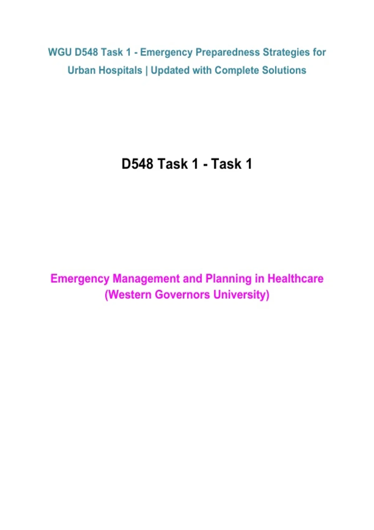 WGU D548 Task 1 – Emergency Response Plan – Western Governors University – Academic Year 2026/2027 – Latest Updated Performance Assessment with Complete Solutions WGU D548 Task 1 – Emergency Management and Planning in Healthcare – Western Governors University – Academic Year 2026/2027 – Latest Updated Performance Assessment with Complete Solutions