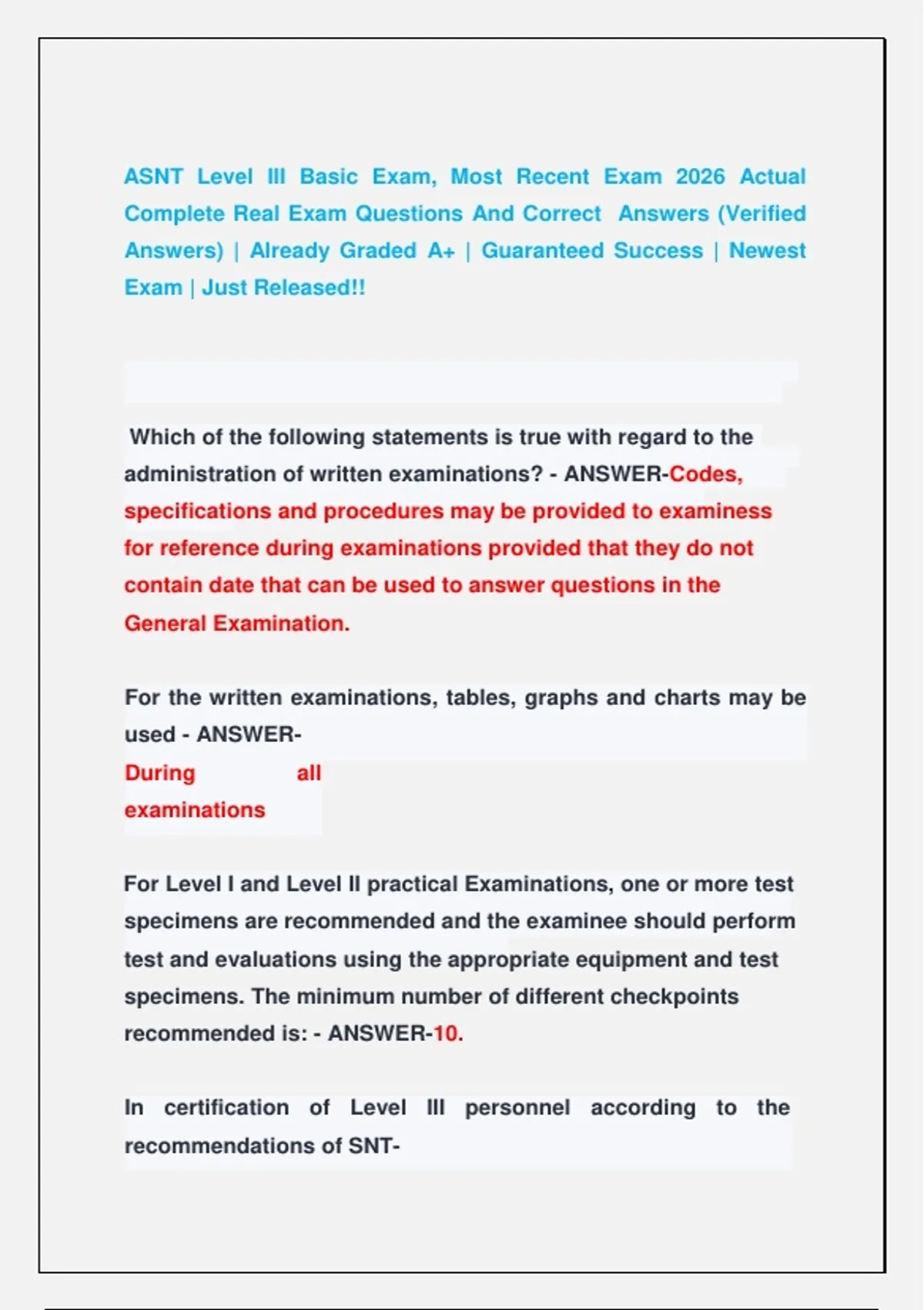ASNT Level III Basic Exam, Most Recent Exam 2026 Actual Complete Real Exam Questions And Correct Answers (Verified Answers) | Already Graded A+ | Guaranteed Success | Newest Exam | Just Released!! ASNT Level III Basic Exam, Most Recent Exam 2026 Actual Complete Real Exam Questions And Correct Answers (Verified Answers) | Already Graded A+