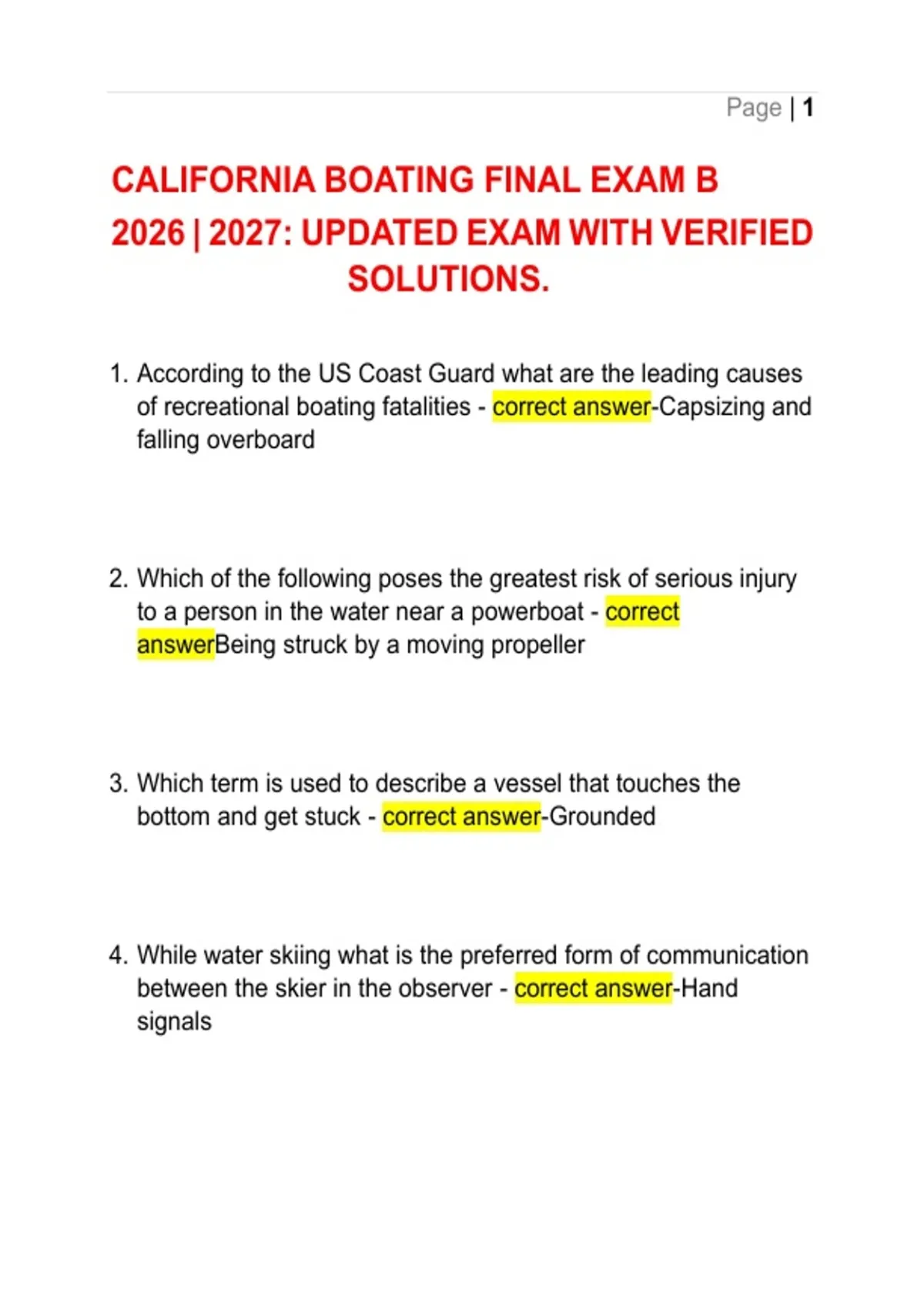CALIFORNIA BOATING FINAL EXAM B (Latest Updates STUDY BUNDLE WITH COMPLETE SOLUTIONS) Questions and Verified Answers | Grade A+ | 100% Correct