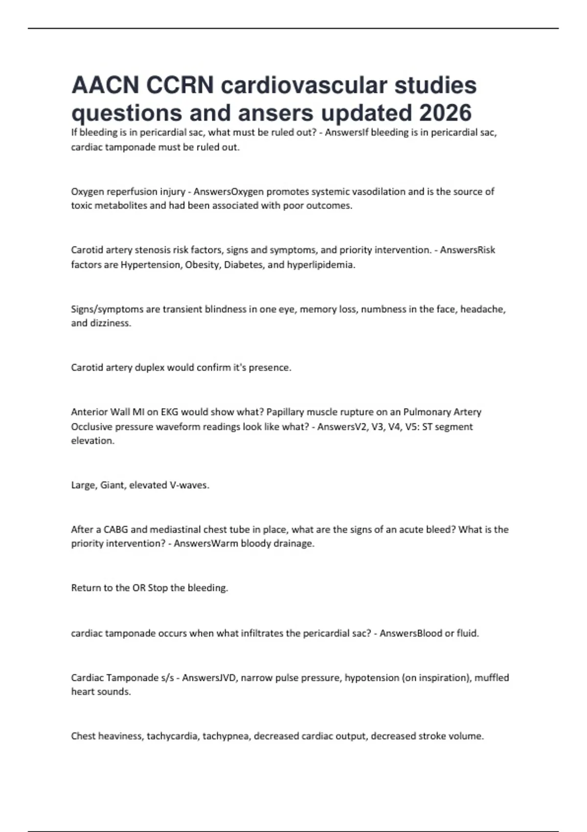 AACN CCRN cardiovascular studies questions and ansers updated 2026