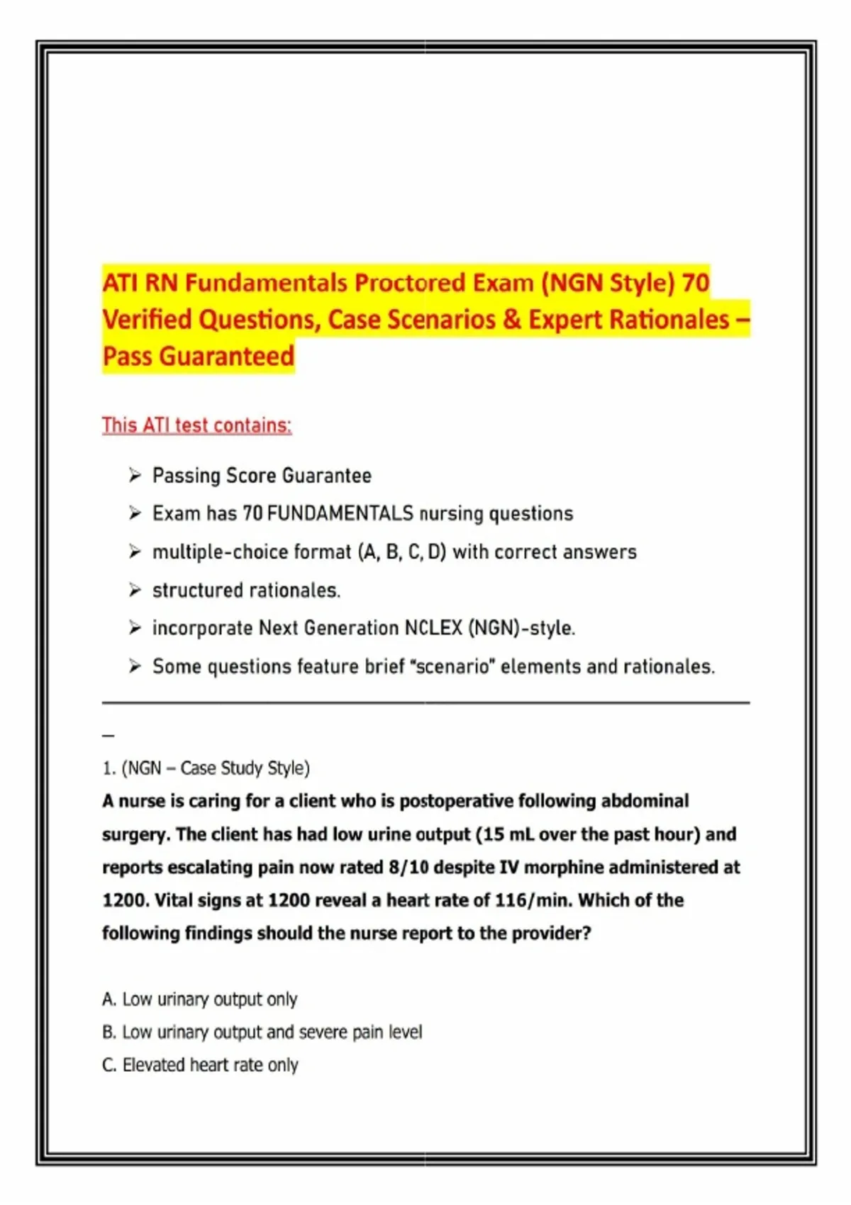 This complete ATI RN Fundamentals bundle is designed for nursing students preparing for the ATI Proctored Exams and the Next Generation NCLEX (NGN). Included in this bundle: - Exam 1: 70 Verified Q&A with NGN case studies - Exam 2: 70 Verified Q&A with NGN case scenarios - Exam 3: 70 Verified Q&A with NGN case scenarios - Exam 4: 70 Verifie