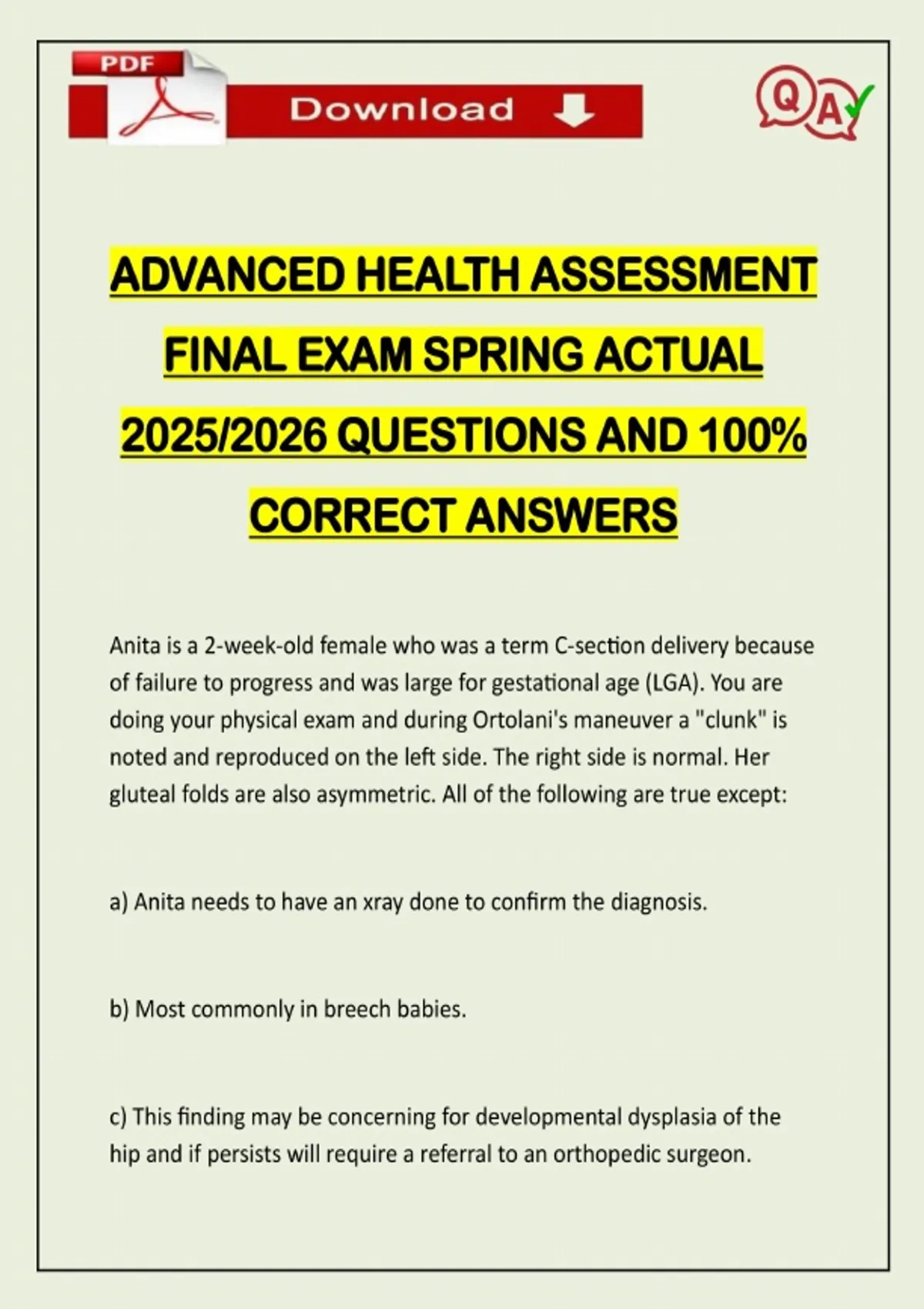 BUNDLED EXAMS::: ADVANCED HEALTH ASSESSMENT EXAMS 1,2,3 & FINALS ACTUAL 2026 UPDATE