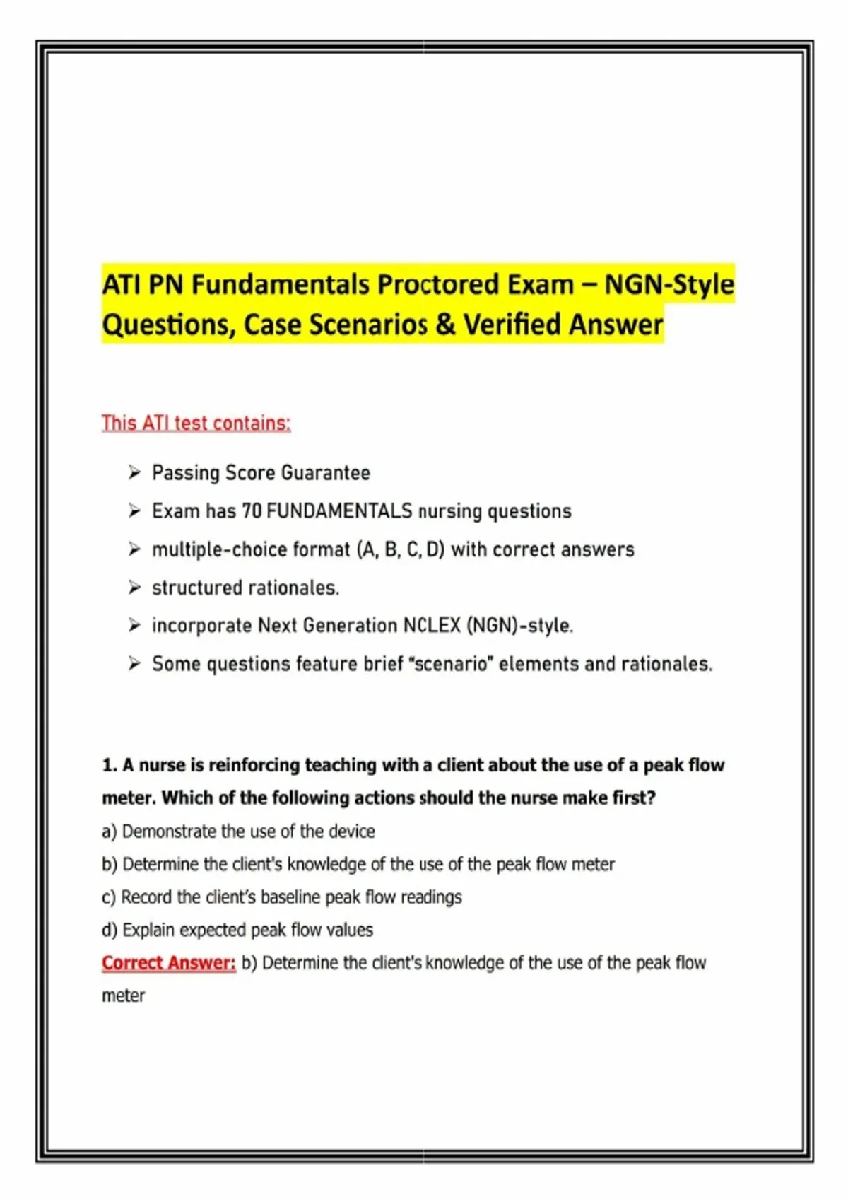 ATI PN Fundamentals Proctored Exam Complete Pack – NGN‑Style Questions, Case Scenarios & Verified Answers (All Versions + Retake Bank)This ATI PN Fundamentals Complete Pack combines all versions of the PN Fundamentals Proctored Exam plus the Retake Question Bank, giving practical nursing students the most comprehensive preparation resource for ATI