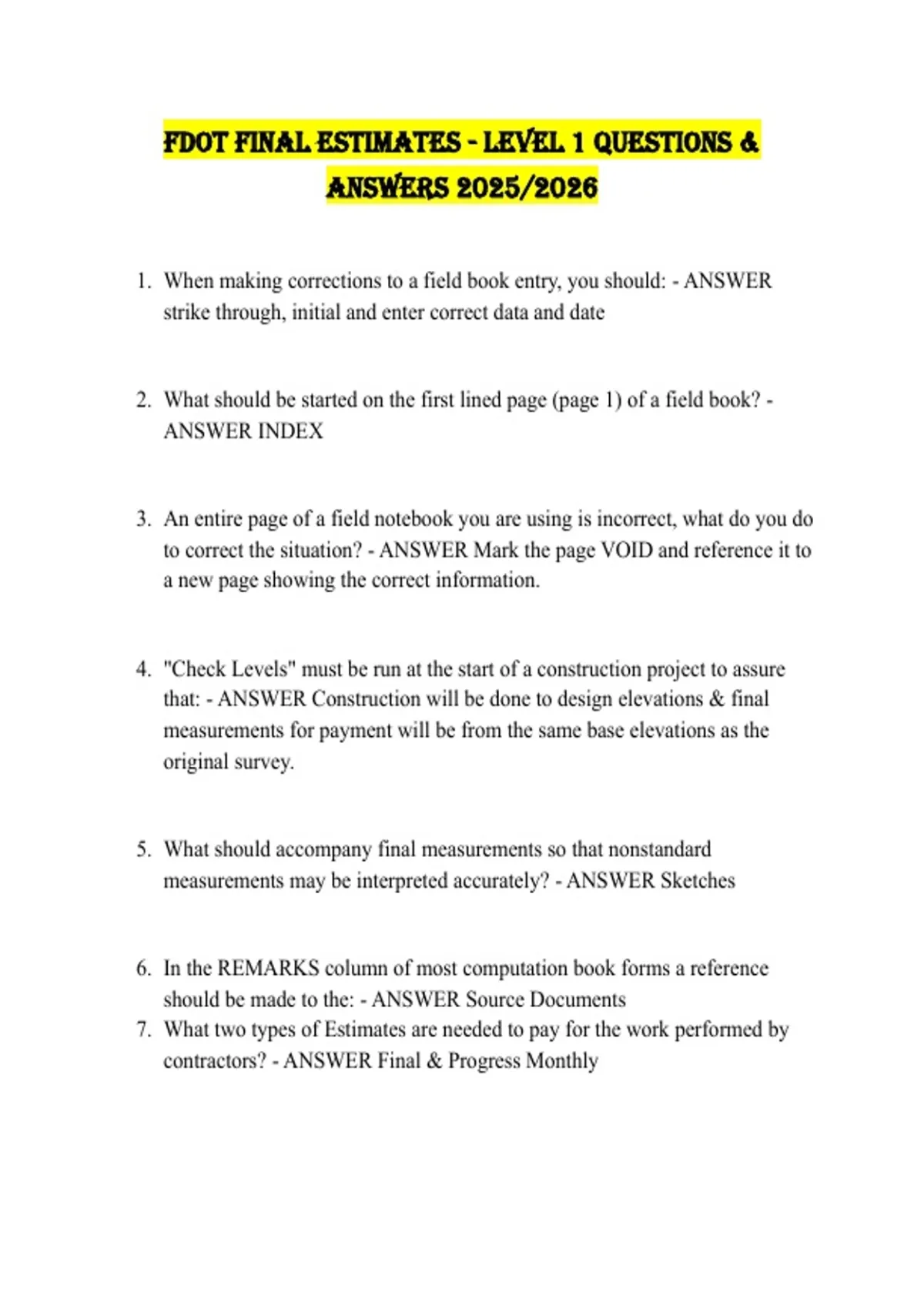 FDOT Final Estimates - Level 1 and 2 Questions & answers 2025/2026