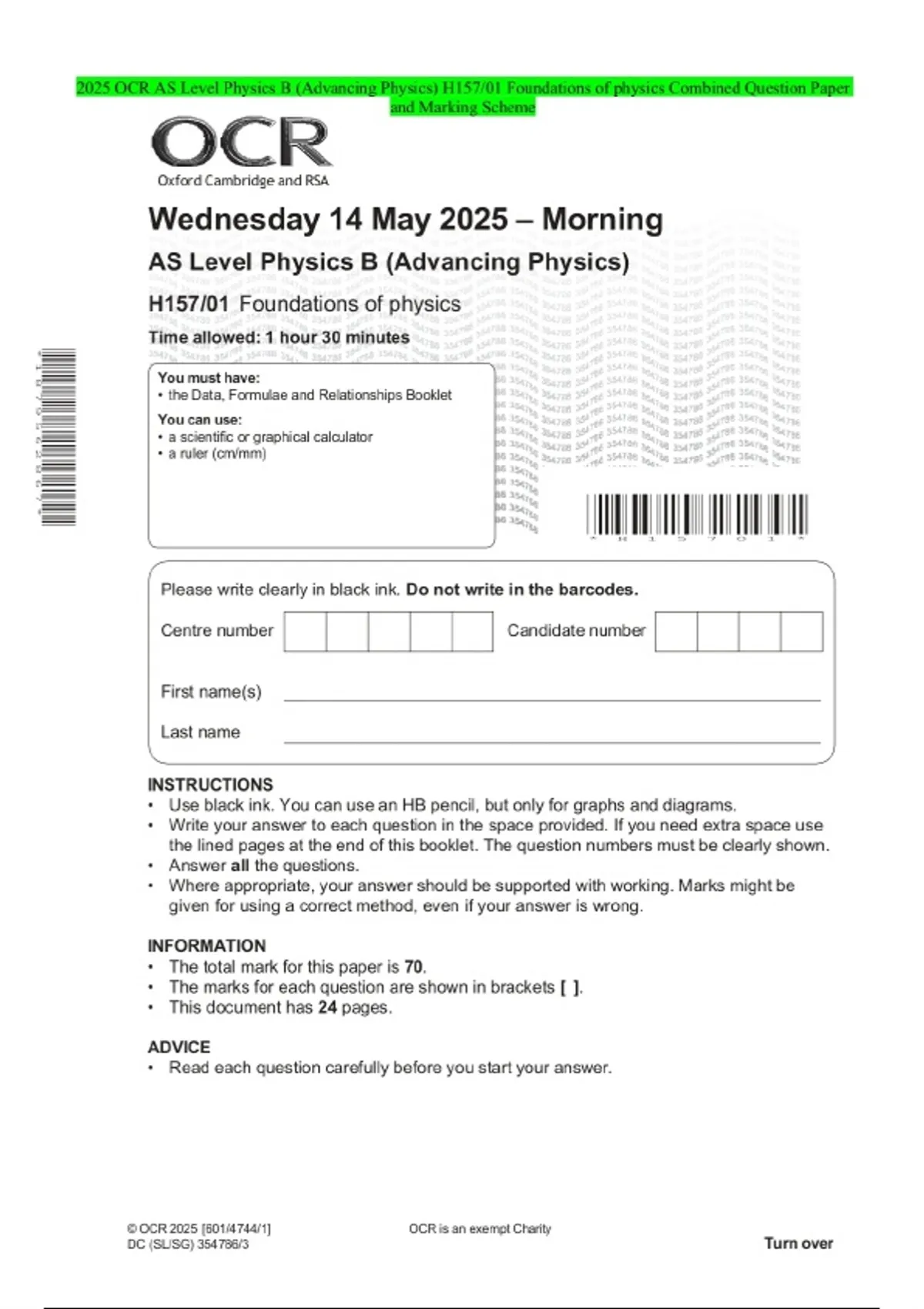 2025 OCR A Level Physics B (Advancing Physics) H557/01 Fundamentals of Physics Combined Question Paper and Marking Scheme 2 Exam (elaborations) 2025 OCR A Level Physics B (Advancing Physics) H557/02 Scientific literacy in physics Combined Question Paper and Marking Scheme 3 Exam (elaborations) 2025 OCR AS Level Physics B (Advancing Physics) H157/