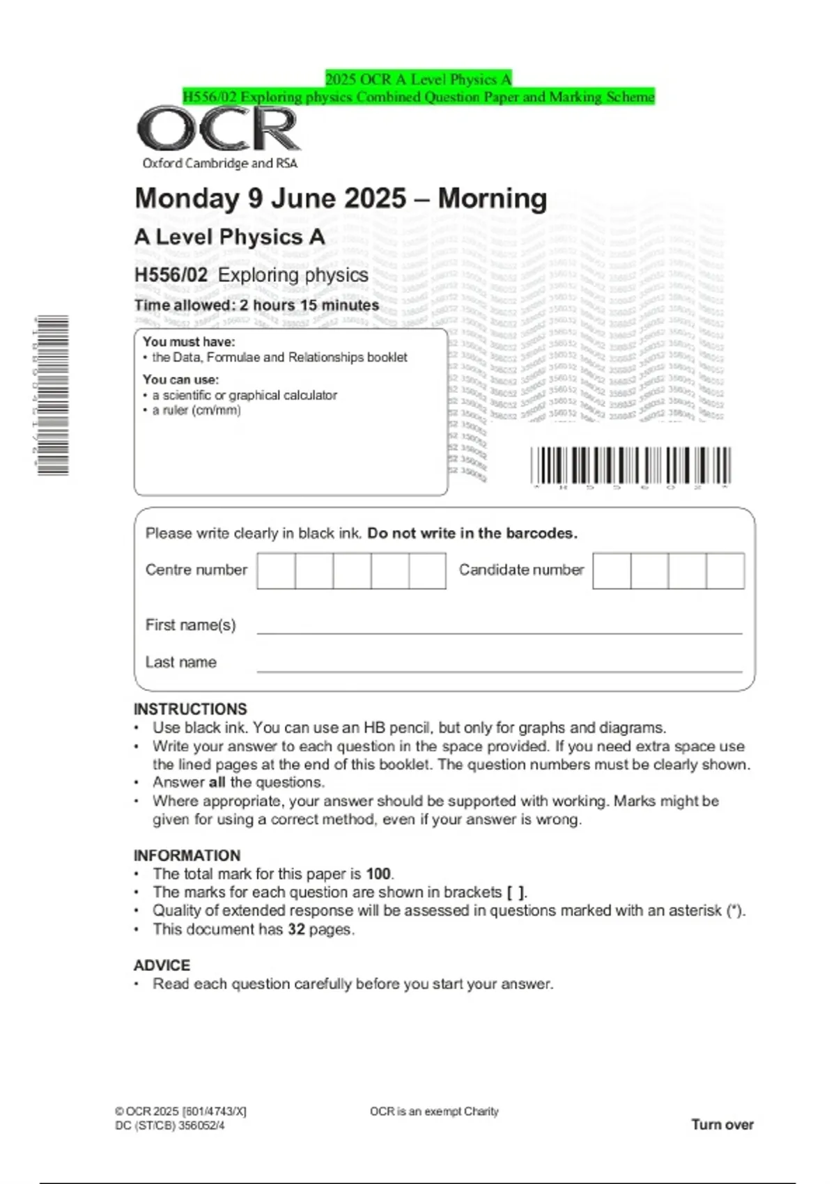 2025 OCR A Level Physics A H556/03 Unified physics Combined Question Paper and Marking Scheme 2 Exam (elaborations) 2025 OCR AS Level Physics A H156/02 Depth in physics Combined Question Paper and Marking Scheme 3 Exam (elaborations) 2025 OCR AS Level Physics A H156/01 Breadth in physics Combined Question Paper and Marking Scheme 4 Exam (elabora