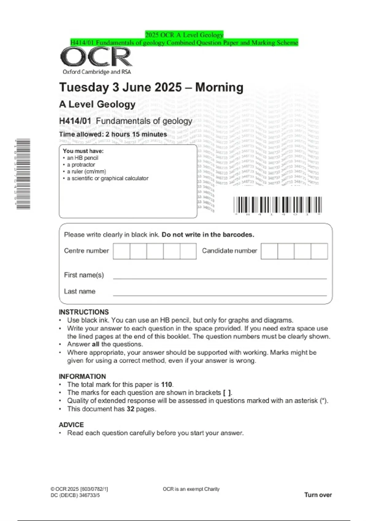 2025 OCR A Level Geology H414/01 Fundamentals of geology Combined Question Paper and Marking Scheme 2 Exam (elaborations) 2025 OCR AS Level Geology H014/01 Geology Combined Question Paper and Marking Scheme 3 Exam (elaborations) 2025 OCR A Level Geology H414/03 Practical skills in geology Combined Question Paper and Marking Scheme