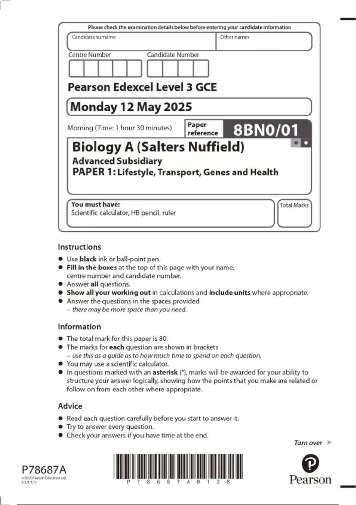 PACKAGE DEAL-::2025 Pearson Edexcel Level 3 GCE Biology A{Salters Nuffield} Advanced Subsidiary Paper 1-2|Combined Question Paper and Marking Scheme
