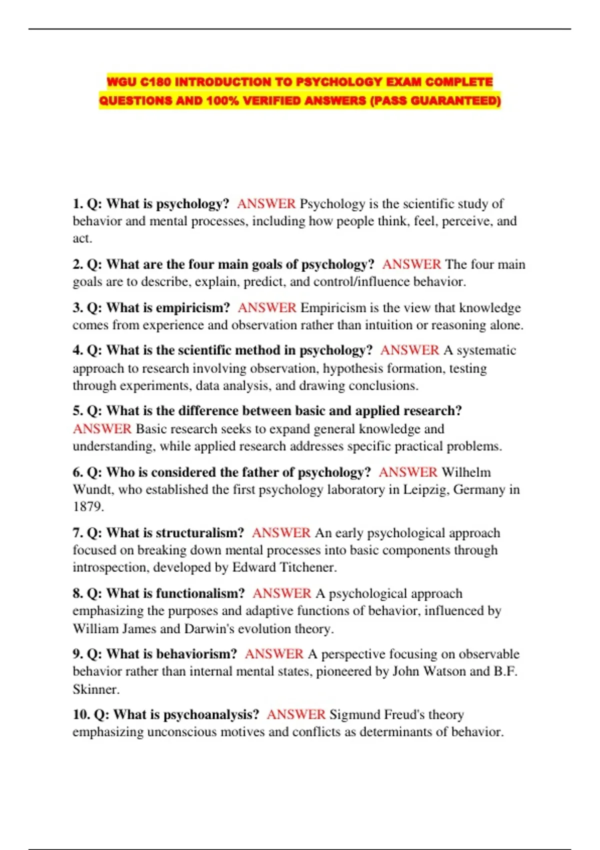 WGU C180 INTRODUCTION TO PSYCHOLOGY NEW VERSION QUESTIONS AND VERIFIED ANSWERS FOR EXAM SUCCESS
