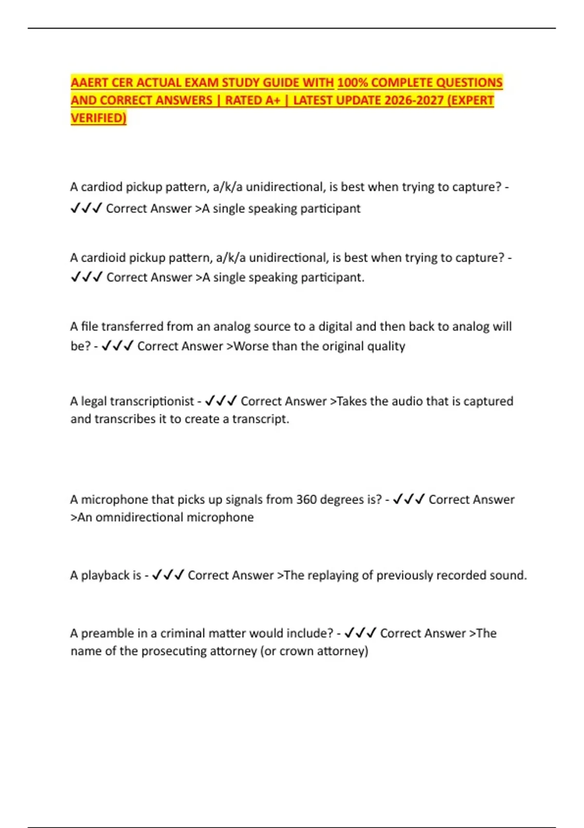 AAERT CDR TEST QUESTIONS WITH ANSWERS – LATEST UPDATE 2026/2027 | AAERT CER ACTUAL EXAM STUDY GUIDE WITH 100% COMPLETE QUESTIONS AND CORRECT ANSWERS & AAERT CDR Exam | Actual Questions With 100% Correct Answers / Latest Update 2026/2027 | Graded A+ (Verif