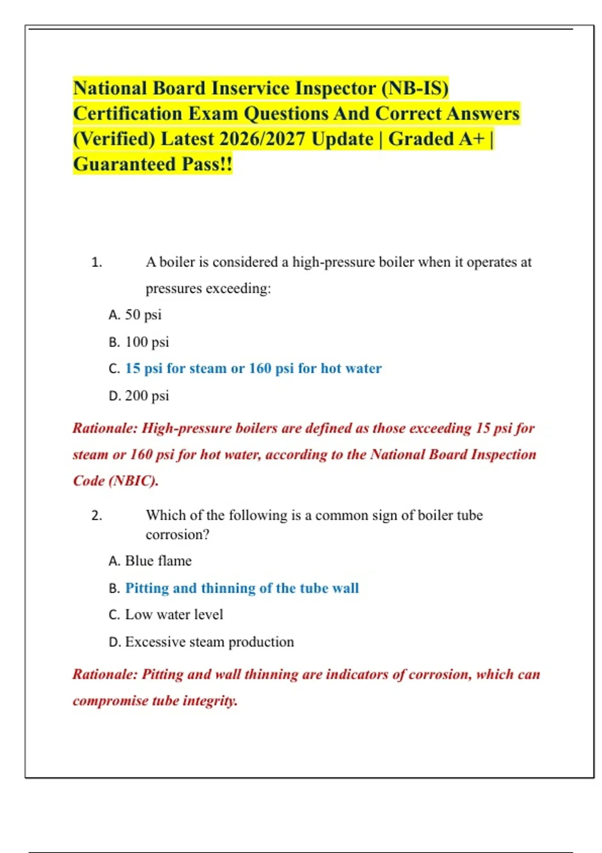 National Board Inservice Inspector (NB-IS) Certification Exam Questions And Correct Answers | National Board Inservice Inspector (NB-IS) Certification Exam Questions And Correct Answers (Verified Answers) Latest Update 2026/2027 | Graded A+ & National Boa