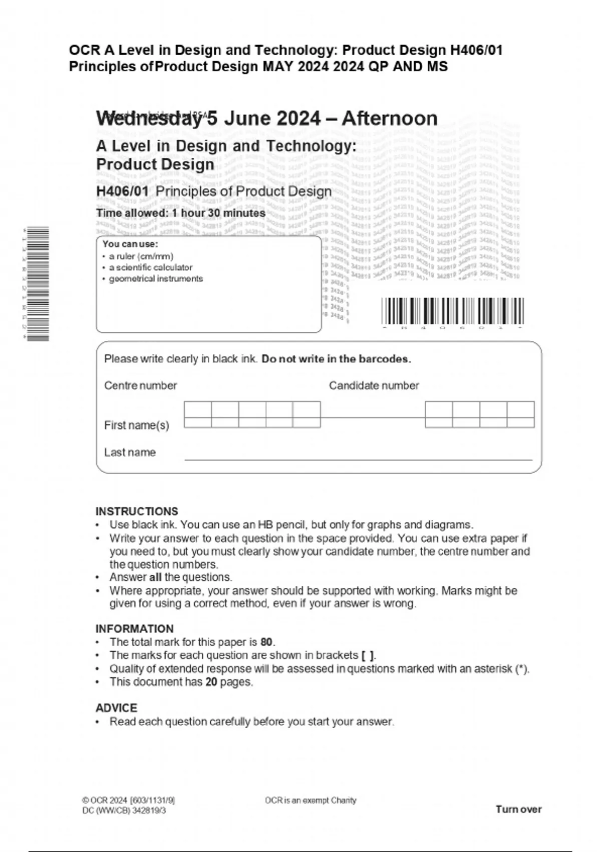 OCR A Level in Design and Technology: Product Design H406/01 Principles of Product Design JUNE 2025 Combined Question Paper and Mark Scheme