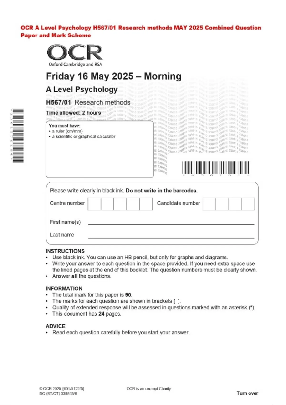 OCR A Level Psychology H567/01 Research methods MAY 2025 Combined Question Paper and Mark Scheme