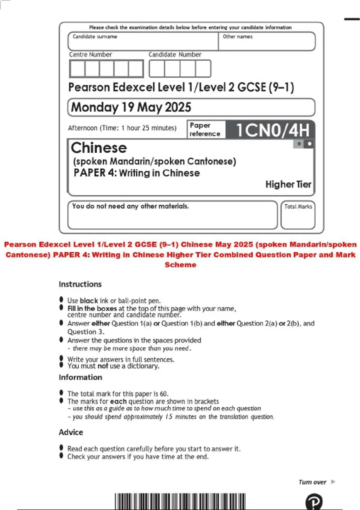 Pearson Edexcel Level 1/Level 2 GCSE (9–1) Chinese May 2025 (spoken Mandarin/spoken Cantonese) PAPER 4: Writing in Chinese Higher Tier Combined Question Paper and Mark Scheme