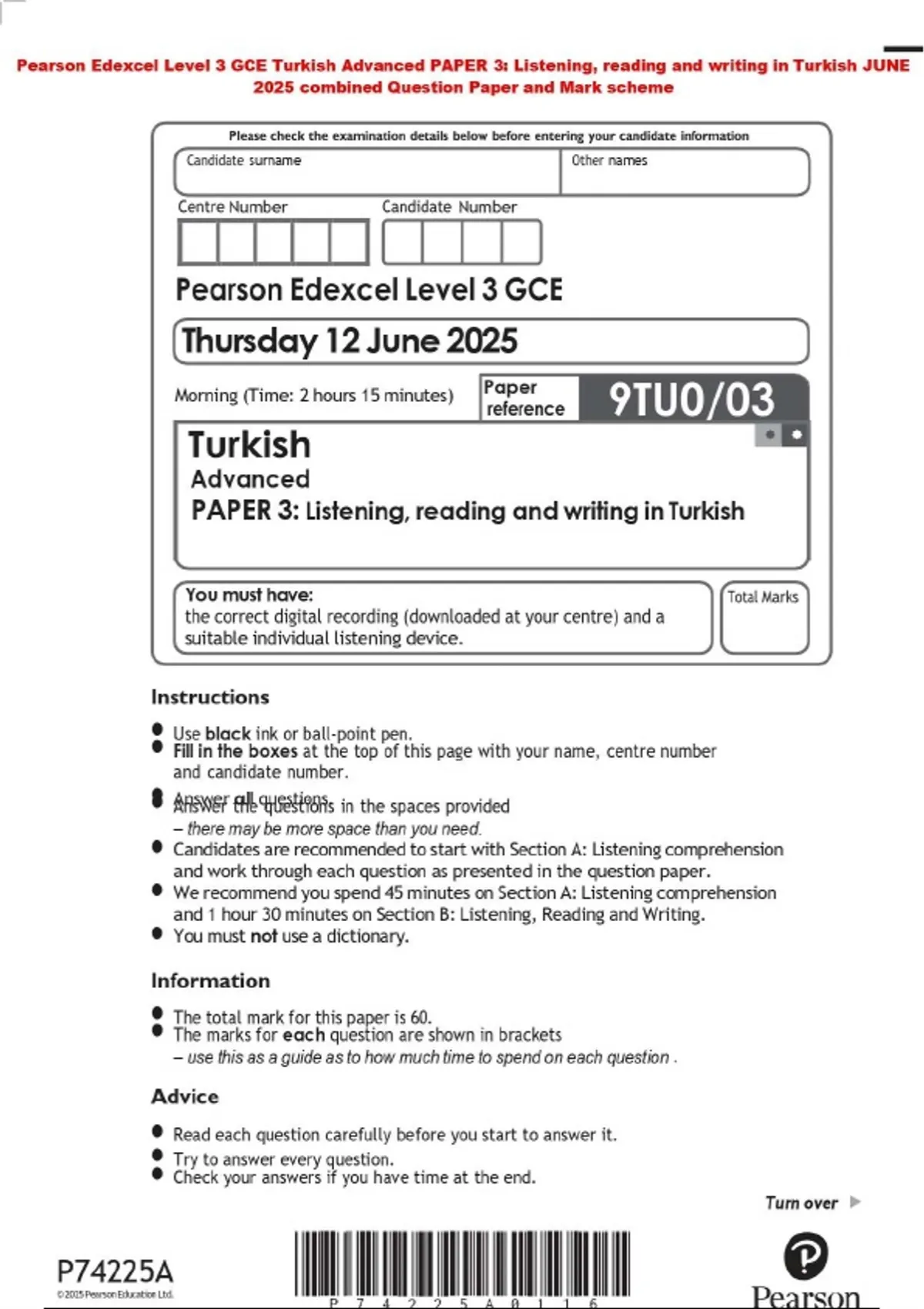 Pearson Edexcel Level 3 GCE Turkish Advanced PAPER 3: Listening, reading and writing in Turkish JUNE 2025 combined Question Paper and Mark scheme