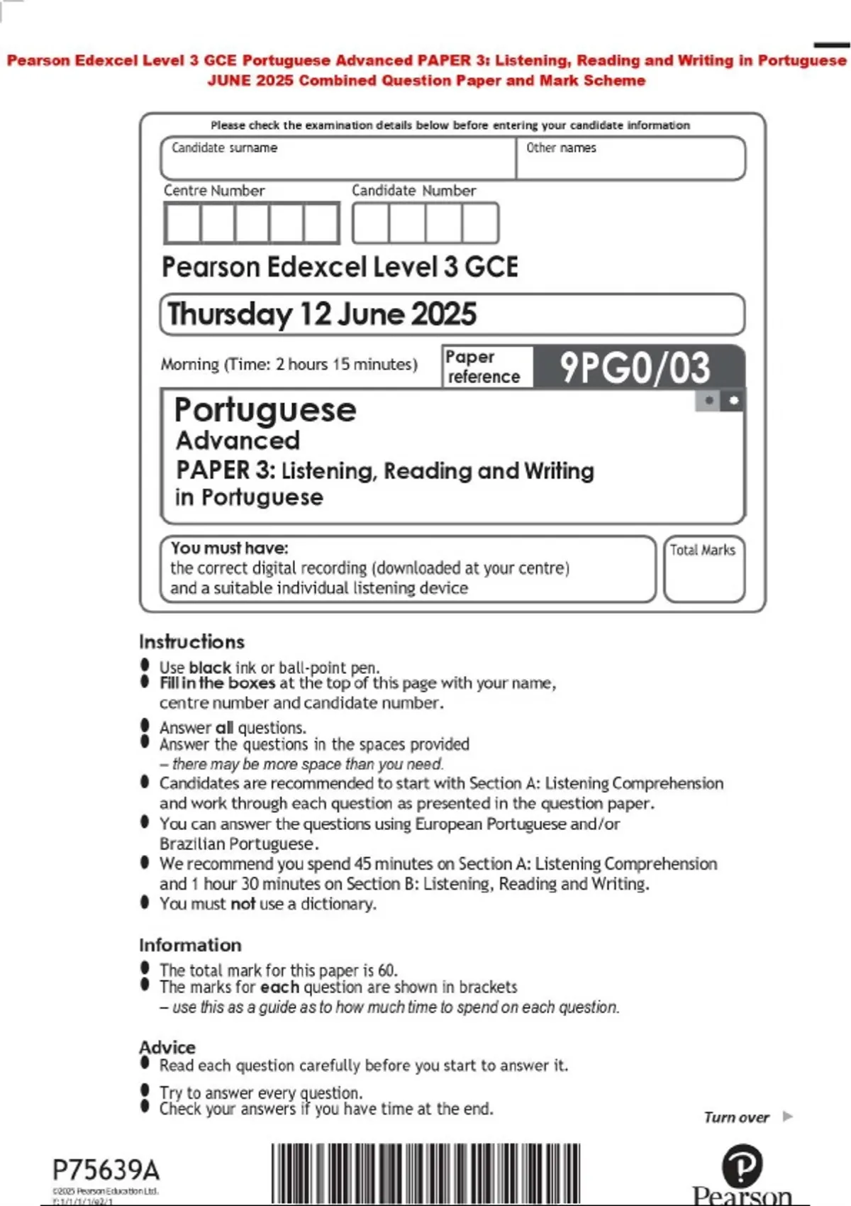 Pearson Edexcel Level 3 GCE Portuguese Advanced PAPER 3: Listening, Reading and Writing in Portuguese JUNE 2025 Combined Question Paper and Mark Scheme