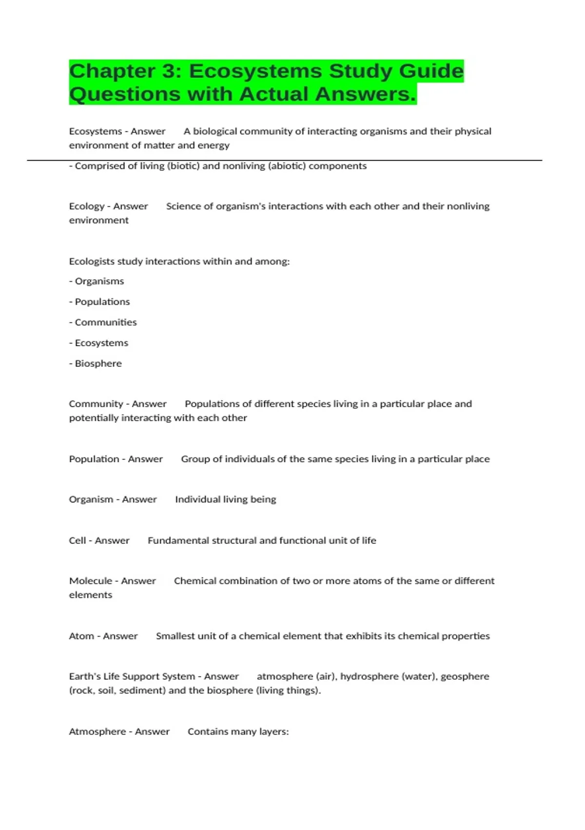 Exam (elaborations) Unit 1 Test-AP Environmental Science Review Guide Questions and Answers. 2 Exam (elaborations) QUIZ#1-PRINCIPLES OF ECOLOGY TEST PAPER AND 100% ACTUAL ANSWERS UPDATE. 3 Exam (elaborations) Post Test: The Interdependence of Ecosystems Questions and Answers.