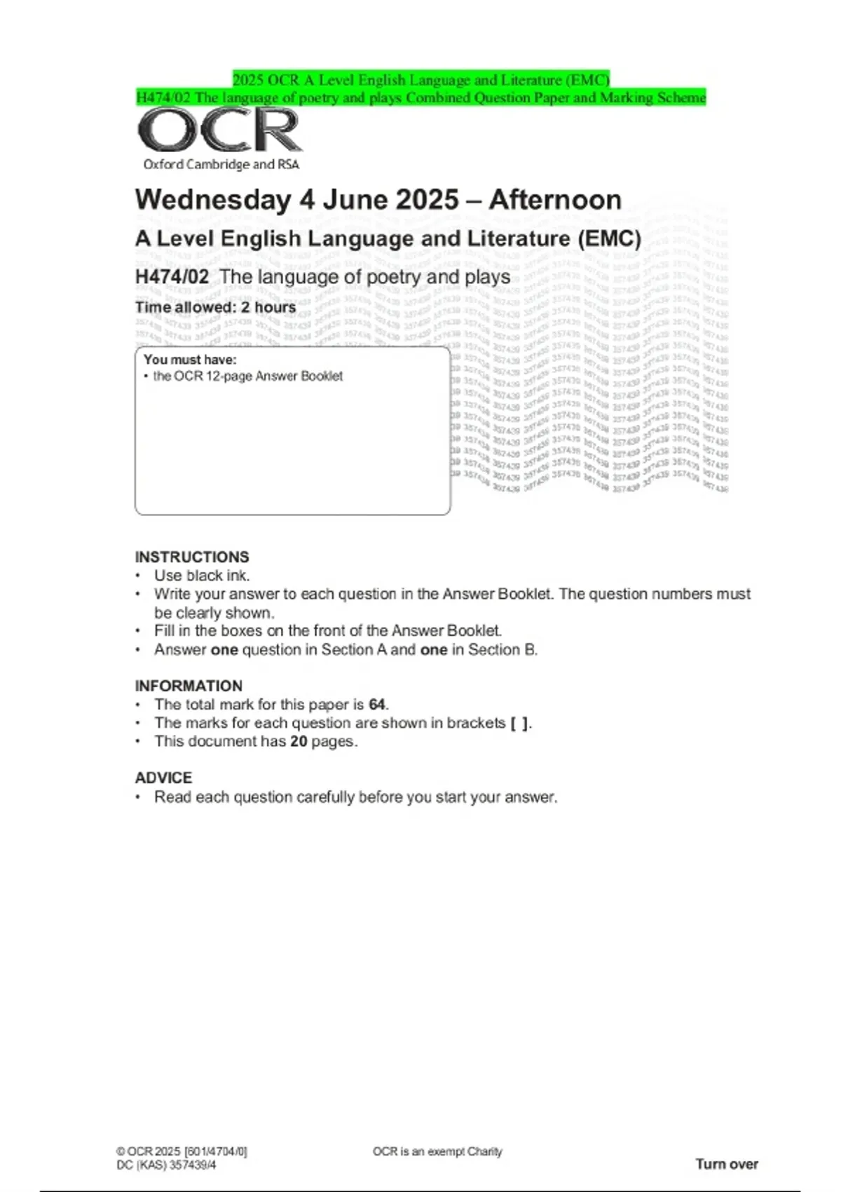 2025 OCR A Level English Language and Literature (EMC) H474/02 The language of poetry and plays Combined Question Paper and Marking Scheme 2 Exam (elaborations) 2025 OCR A Level English Language and Literature (EMC) H474/03 Reading as a writer, writing as a reader Combined Question Paper and Marking Scheme 3 Exam (elaborations) 2025 OCR AS Level