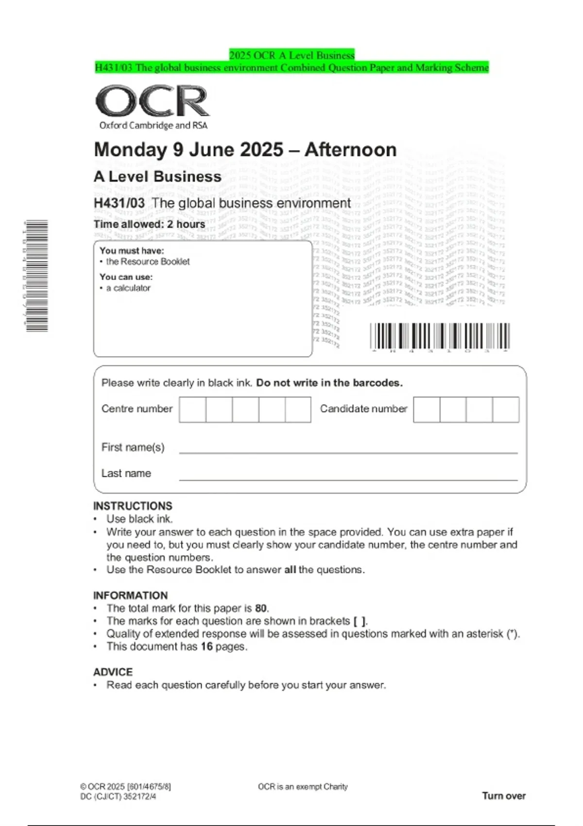 2025 OCR A Level Business H431/03 The global business environment Combined Question Paper and Marking Scheme 2 Exam (elaborations) 2025 OCR AS Level Business H031/01 The local business environment Combined Question Paper and Marking Scheme 3 Exam (elaborations) 2025 OCR A Level Business H431/02 The UK business environment Combined Question Paper