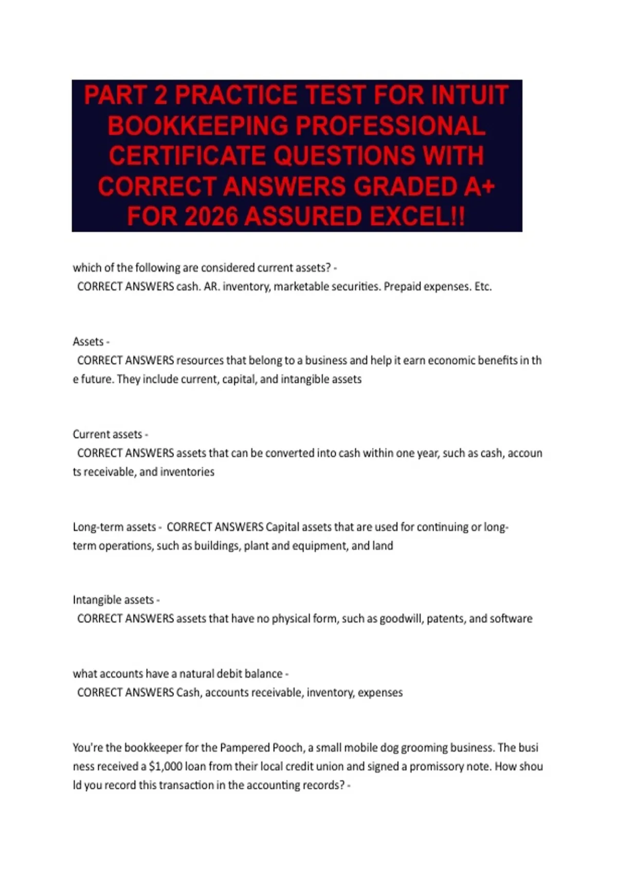 PART 1 PRACTICE TEST FOR INTUIT BOOKKEEPING PROFESSIONAL CERTIFICATE QUESTIONSNWITH COREECT ANSWERS GRADED A+