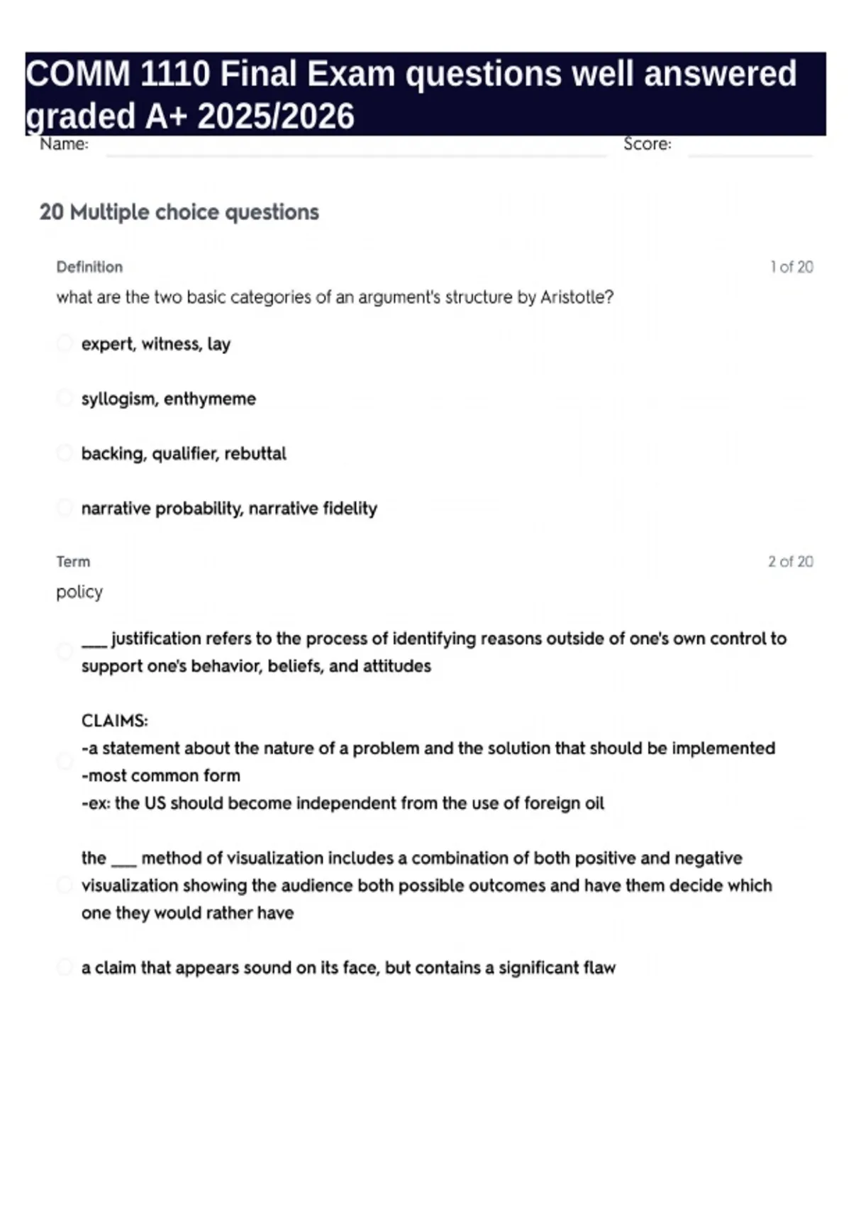1 Exam (elaborations) Comm 1110 test 1 questions well answered graded A+ 2025/2026 2 Exam (elaborations) COMM 1110 Midterm Exam -1 questions well answered graded A+ 2025/2026 3 Exam (elaborations) COMM 1110 Final Exam Study Guide questions with verified answered 2025/2026 4 Exam (elaborations) COMM 1110 Exam 2 questions with correct answers (upd