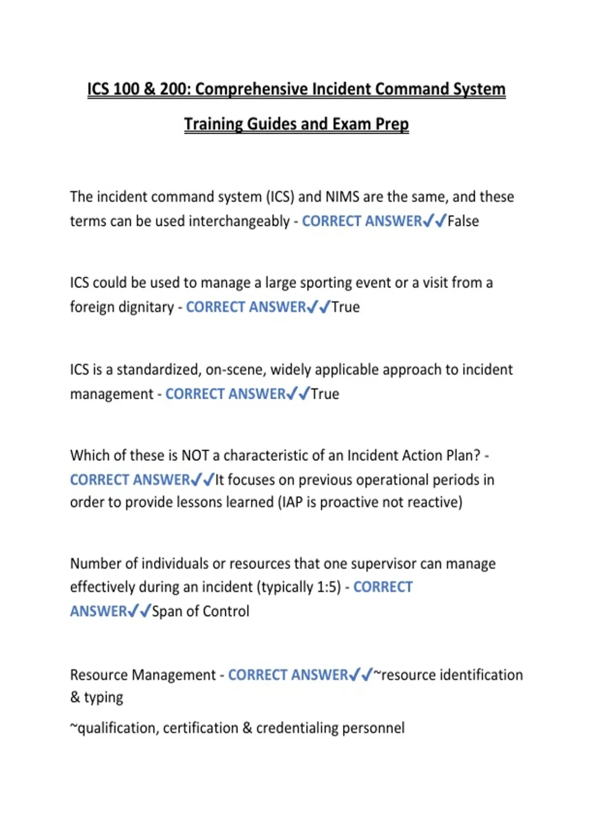 Get everything you need to master Introduction to the Incident Command System (ICS-100) in one discounted bundle! This mega collection includes 7 high-quality PDFs covering full lessons, overviews, comprehensive study guides, practice questions, and multiple final exam versions with 100% verified correct answers and explanations – all aligned with
