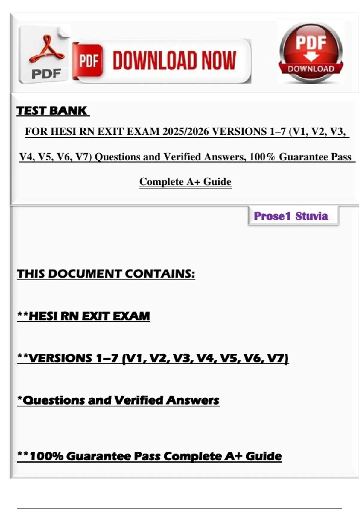 Study Bundle For HESI RN EXIT EXAM 2025/2026 VERSIONS 1–7 (V1, V2, V3, V4, V5, V6, V7) Questions and Verified Answers, 100% Guarantee Pass Complete A Guide