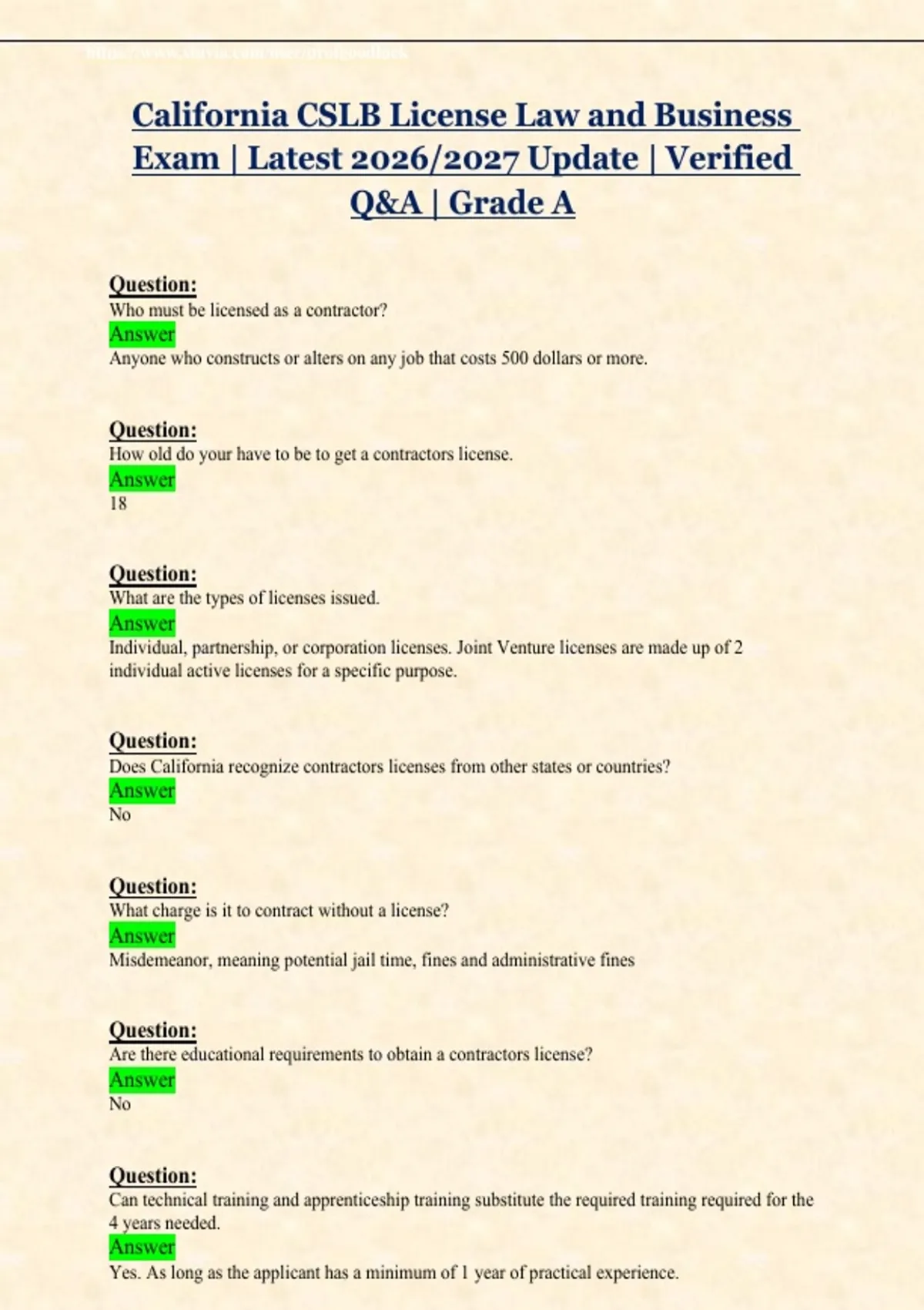 CSLB License Law & Business Exam Guide (2026/2027) | 100% Verified Questions & Answers | Grade A