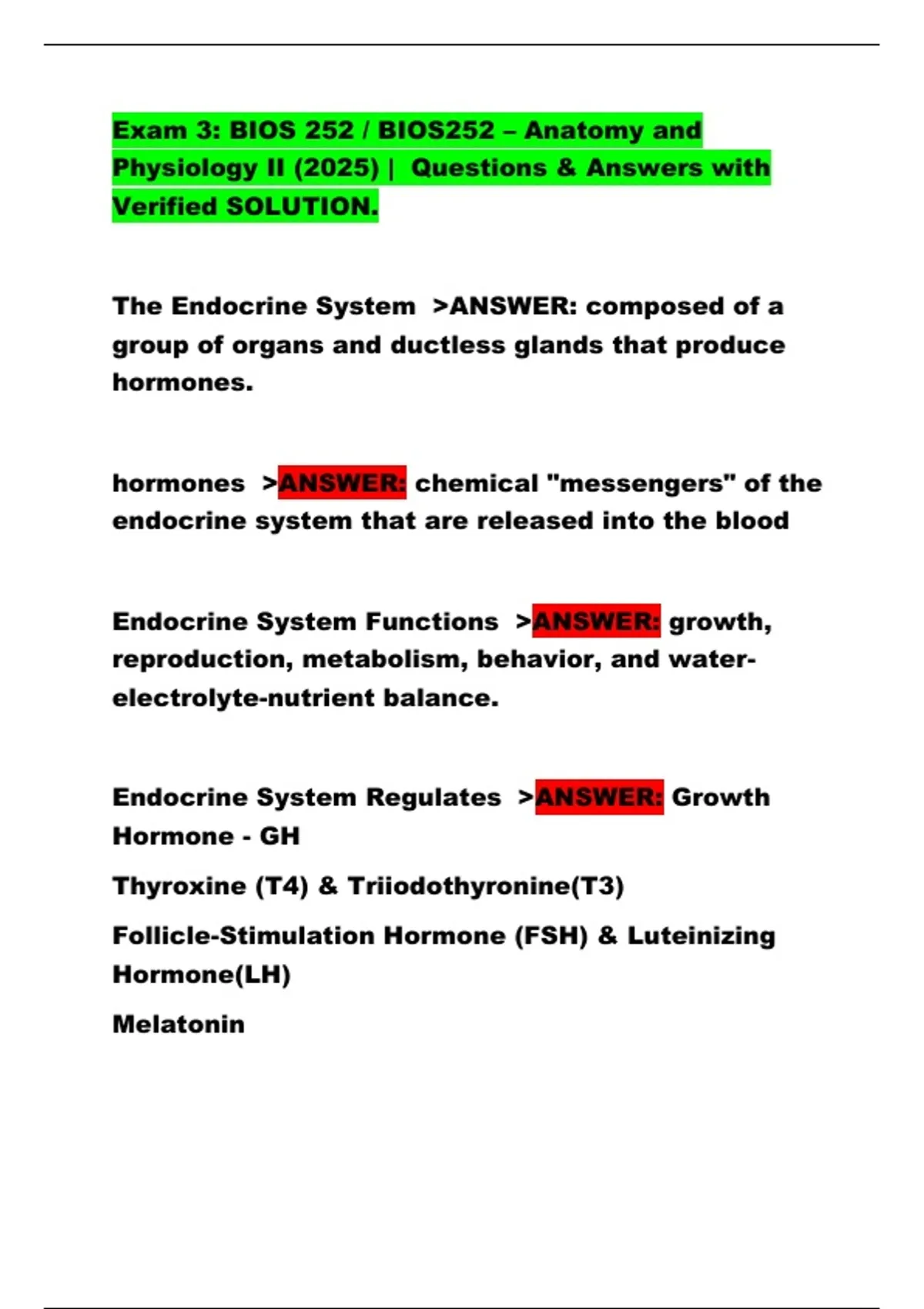 Exam 3: BIOS 252 / BIOS252 – Anatomy and Physiology II (2025) | Questions & Answers with Verified SOLUTION.