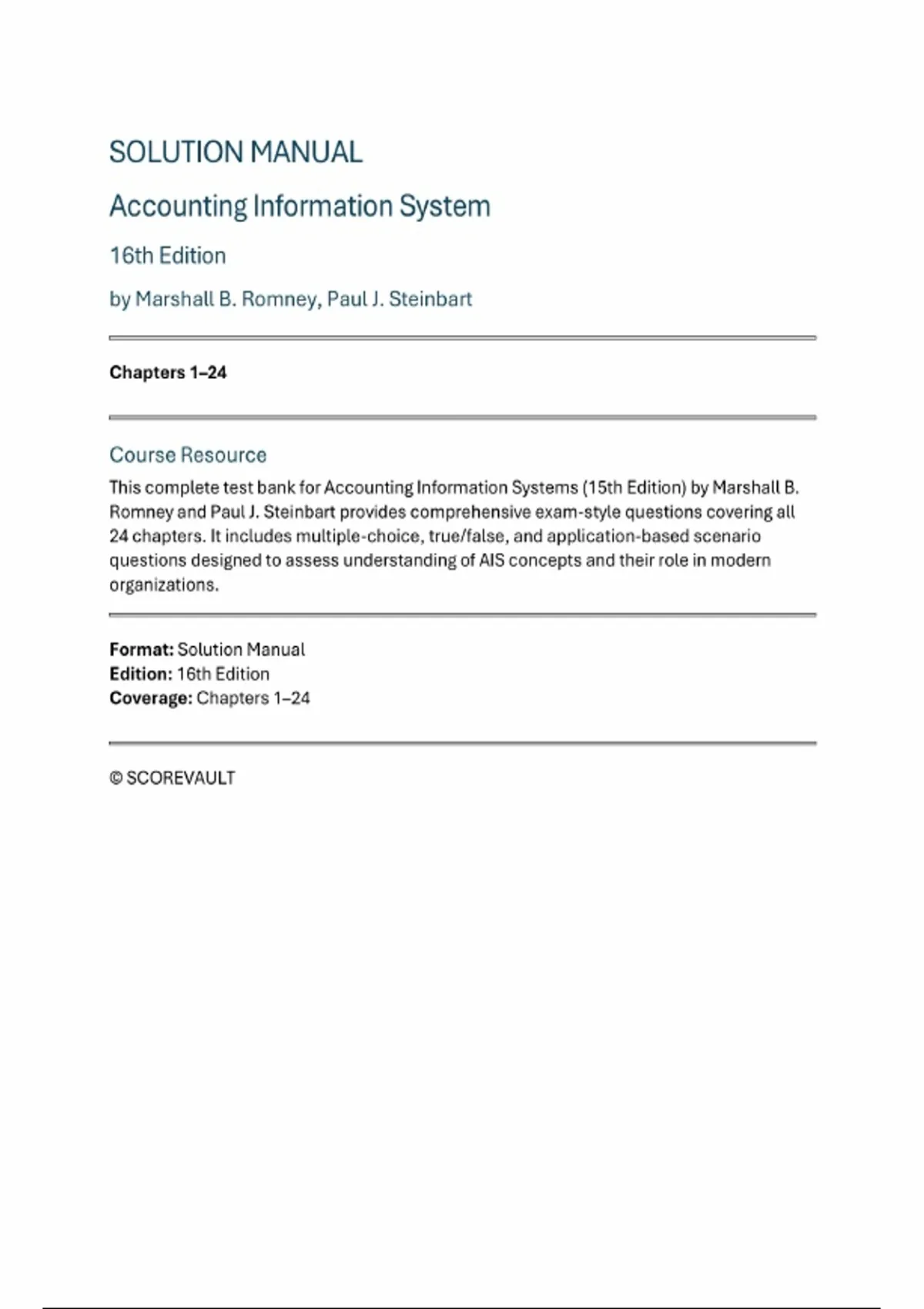 Accounting Information Systems (16th Edition, Marshall B. Romney & Paul J. Steinbart) — Complete Solutions Manual & Test Bank (Chapters 1–24) | Package Deal.