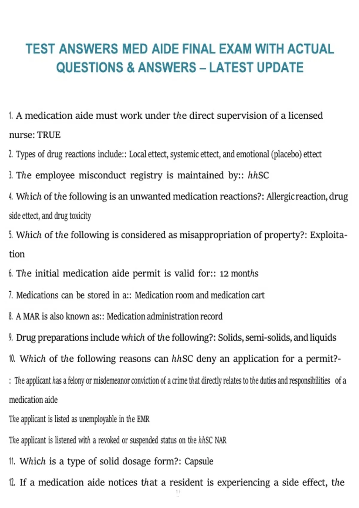 Medication Aide State Exam – Practice Questions with 100% Correct Answers for Certification Preparation