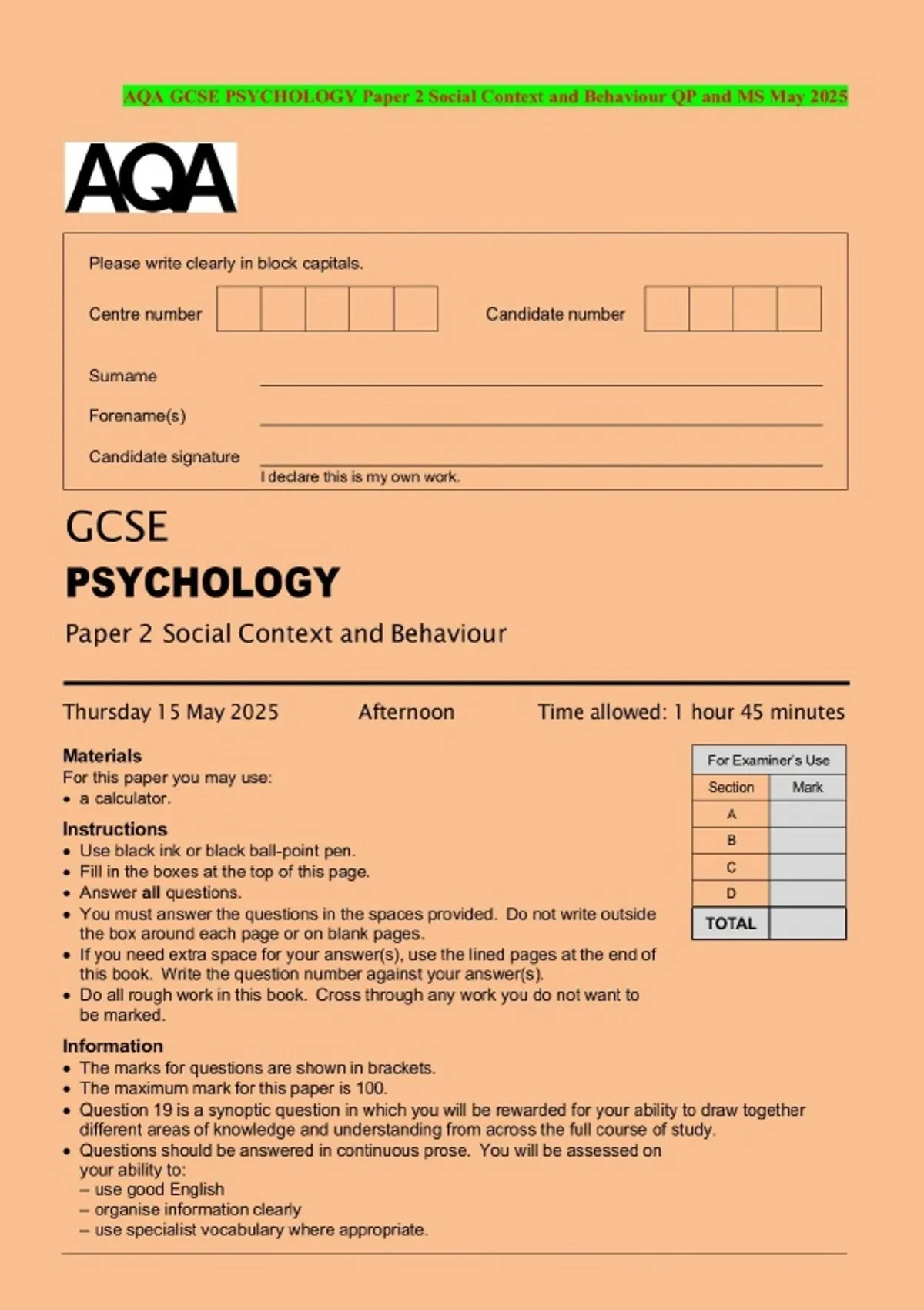 BUNDLE:::AQA GCSE PSYCHOLOGY 2025 Combined Question Paper and Mark Scheme