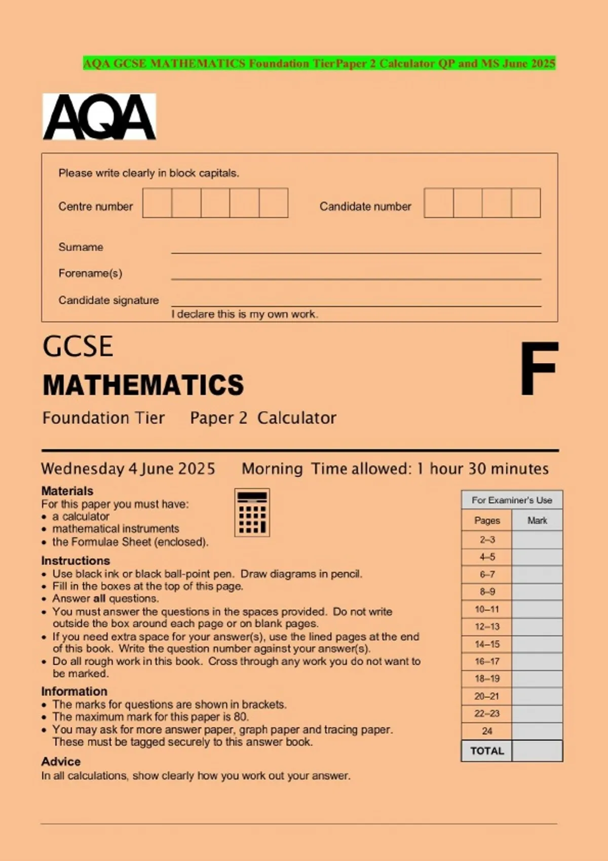 AQA GCSE MATHEMATICS Foundation TierPaper 2 Calculator QP and MS June 2025