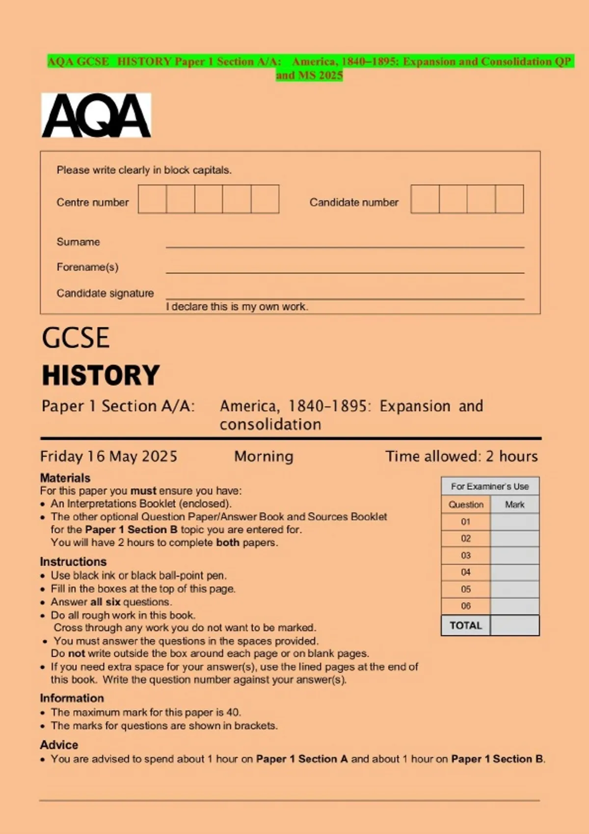 AQA GCSE HISTORY Paper 1 Section A/A: America, 1840–1895: Expansion and Consolidation QP and MS 2025