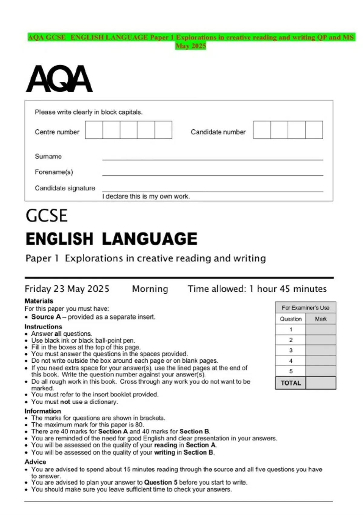 BUNDLE:::AQA GCSE ENGLISH LANGUAGE 2025 Combined Question Paper and Mark Scheme
