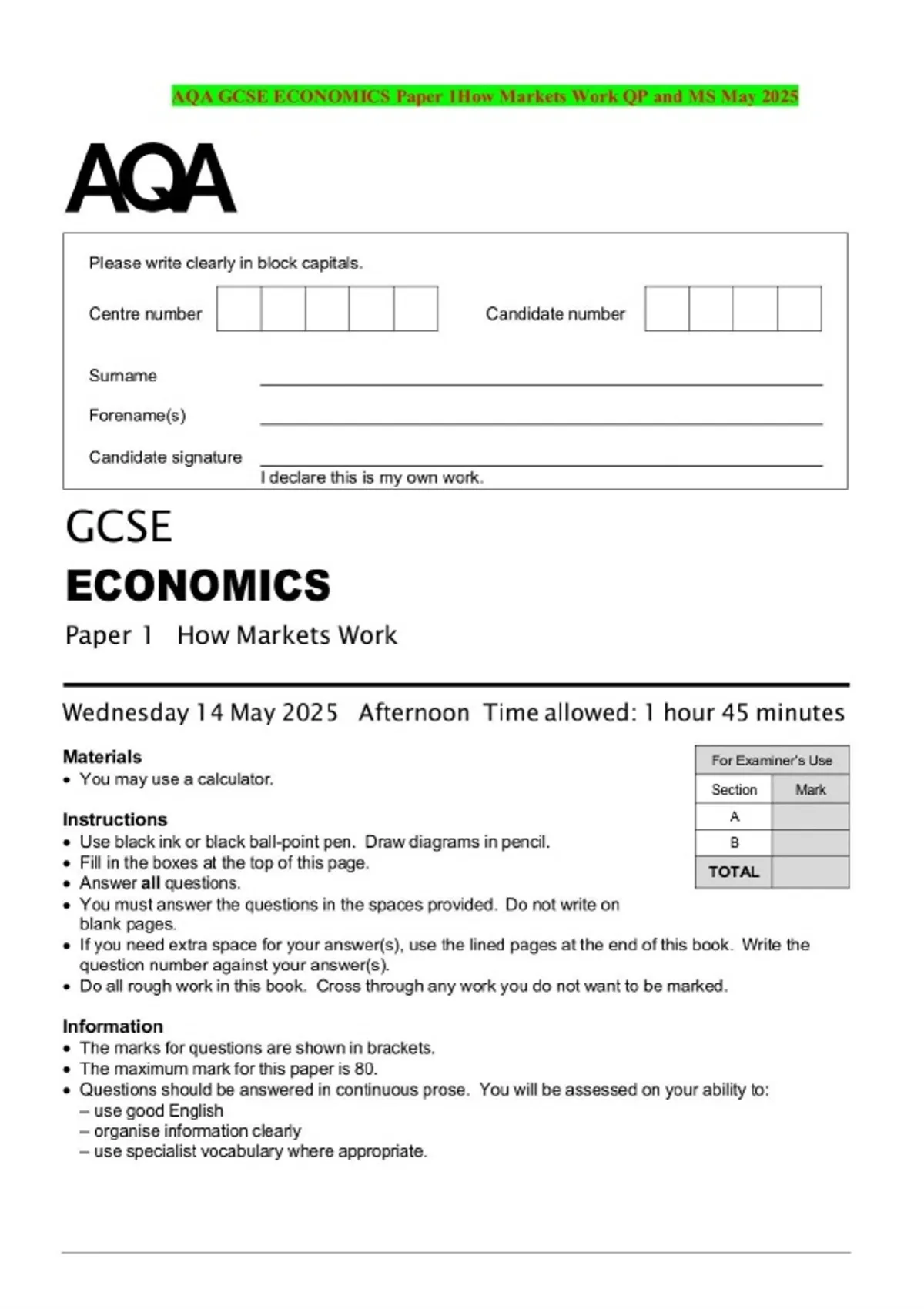 BUNDLE:::AQA GCSE ECONOMICS 2025 Combined Question Paper and Mark Scheme
