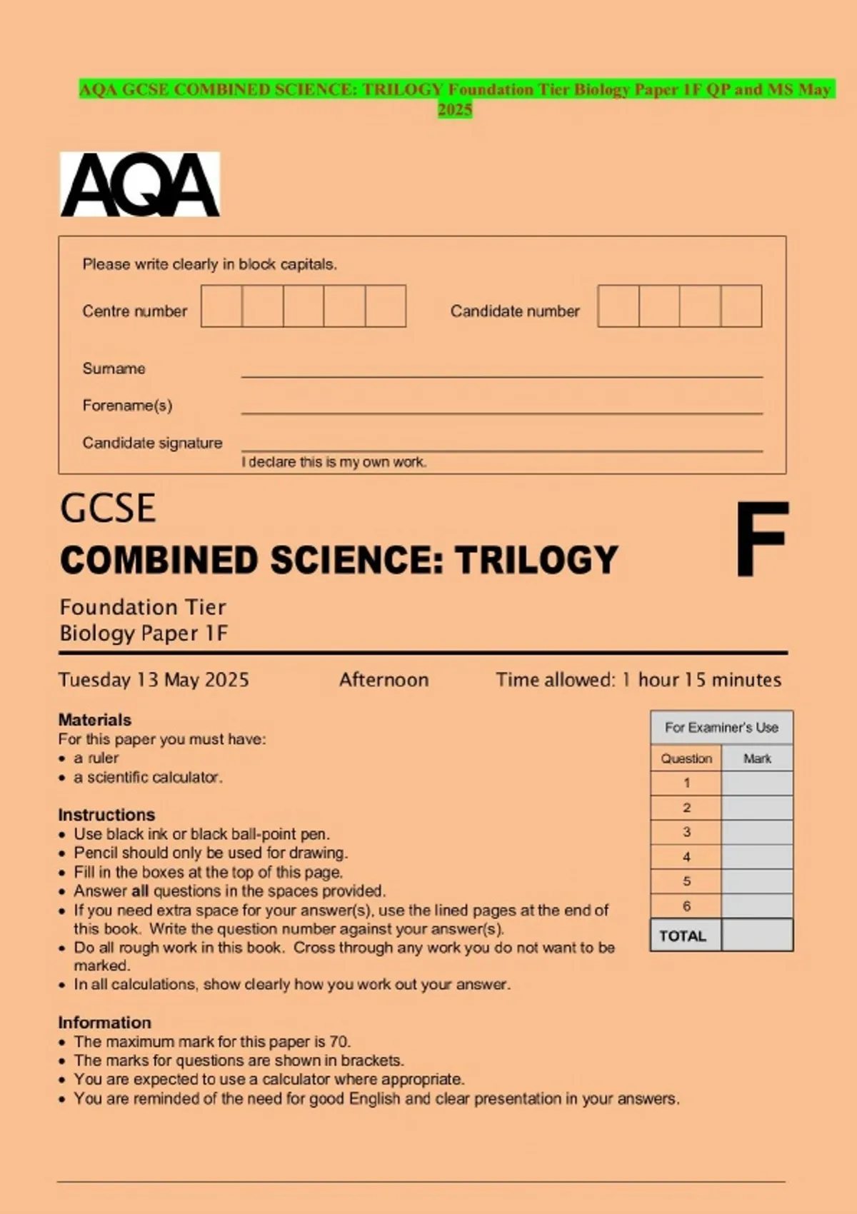 AQA GCSE COMBINED SCIENCE: TRILOGY Foundation Tier Biology Paper 1F QP and MS May 2025