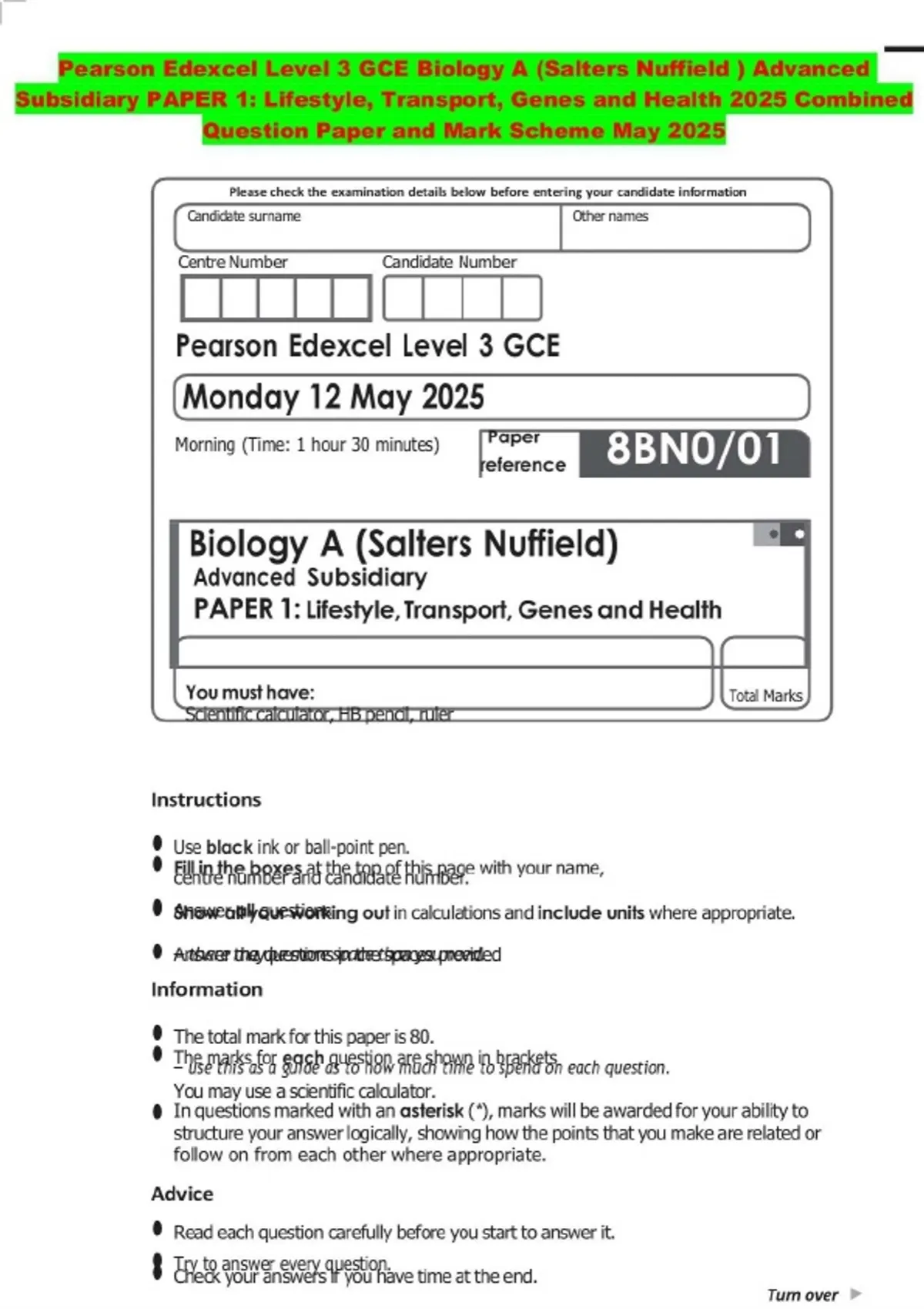 Pearson Edexcel Level 3 GCE Biology A (Salters Nuffield ) Advanced Subsidiary PAPER 1: Lifestyle, Transport, Genes and Health 2025 Combined Question Paper and Mark Scheme May 2025