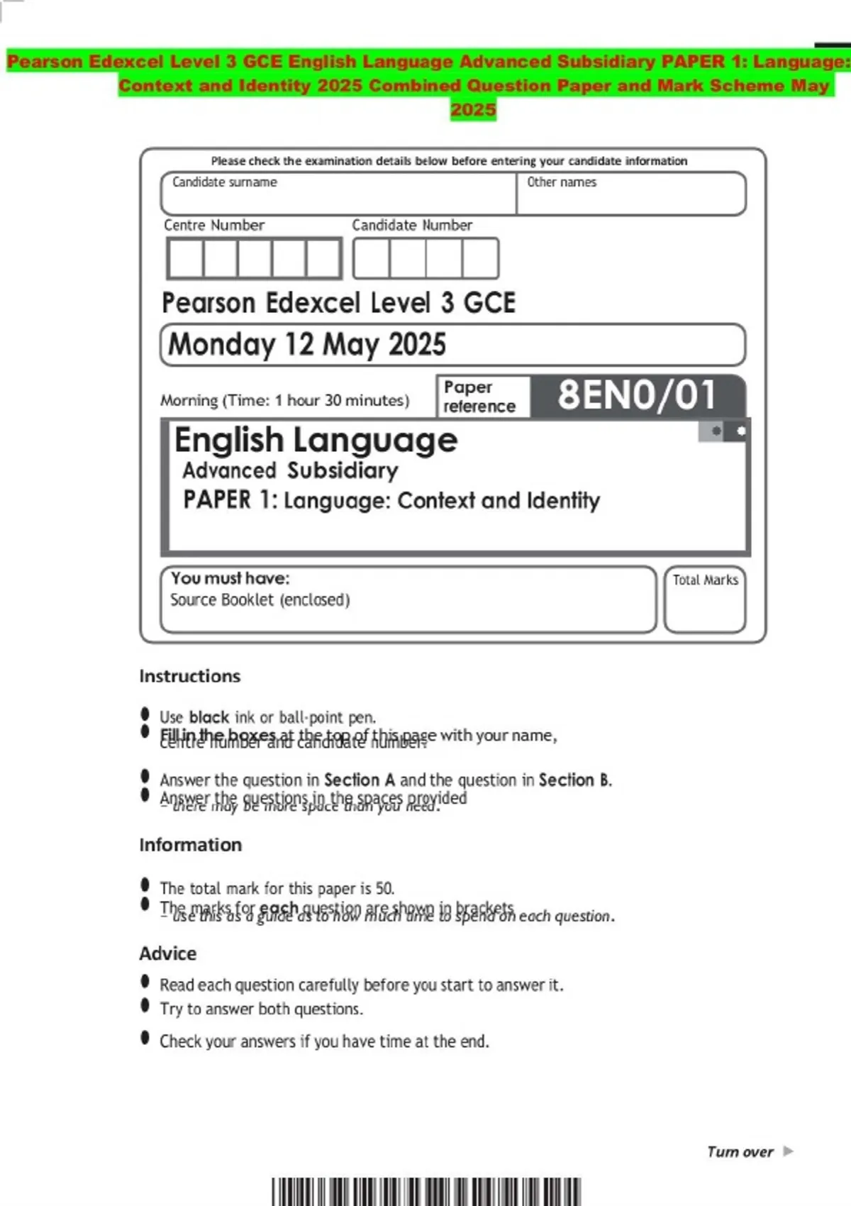 Pearson Edexcel Level 3 GCE English Language Advanced Subsidiary PAPER 1: Language: Context and Identity 2025 Combined Question Paper and Mark Scheme May 2025