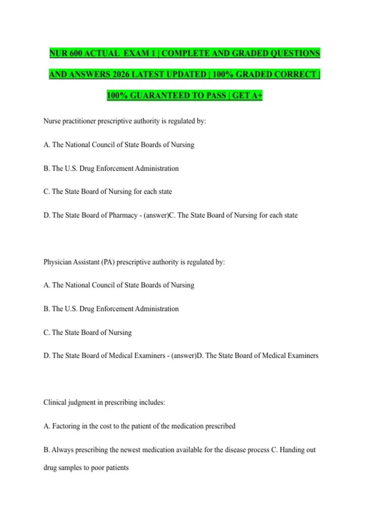PACKAGE DEAL FOR NUR 600 ADVANCED CLINICAL PHARMACOLOGY EXAM 1-5 & FINAL EXAM | COMPLETE AND GRADED QUESTIONS AND ANSWERS 2026 LATEST UPDATED | 100% GRADED CORRECT | 100% GUARANTEED TO PASS | GET A+