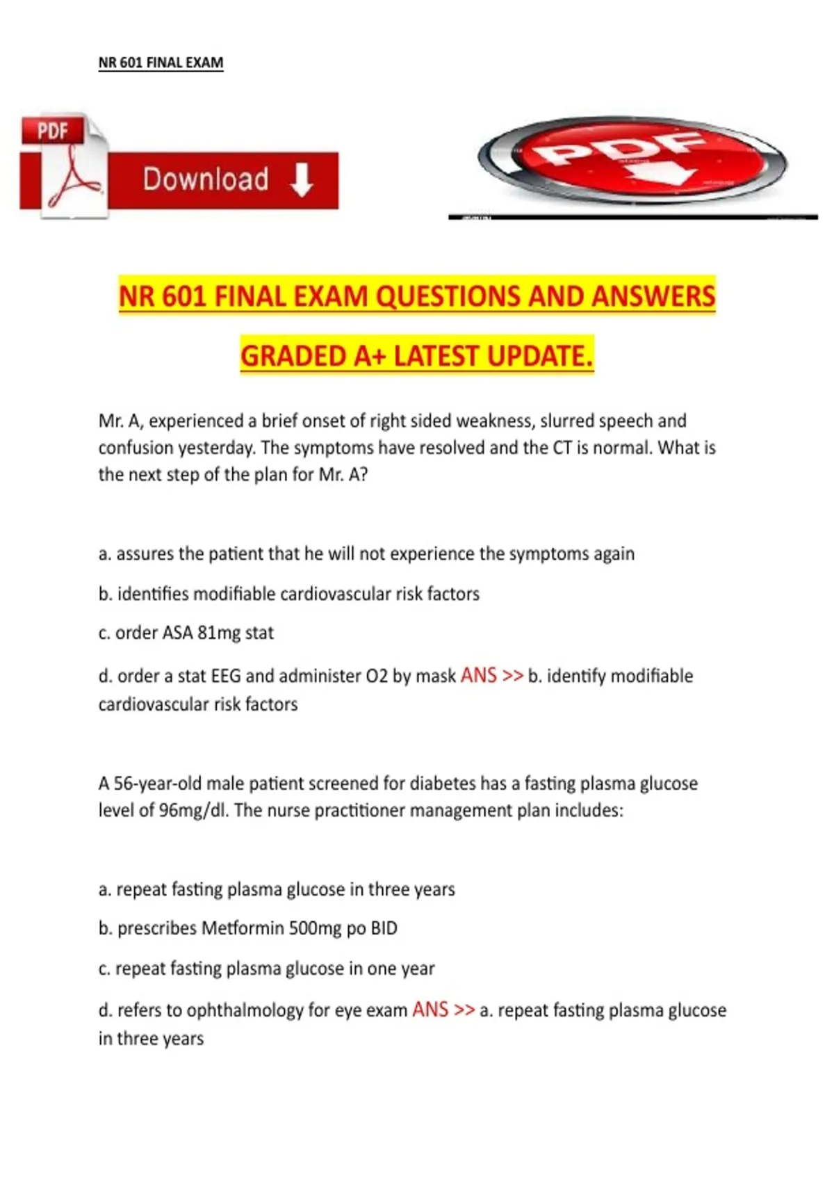 NR 601 Final Exam Questions and Answers – Latest Update – complete exam material NR 601 Midterm Exam – Graded A+ – Latest Update – Complete Questions and Answers NR 601 Primary Care of the Maturing and Aged Family (NR 601) – Academic Year 2026 – Final exam prep test bank with questions and correct answers NR 601 Primary Care of the Maturing & Aged