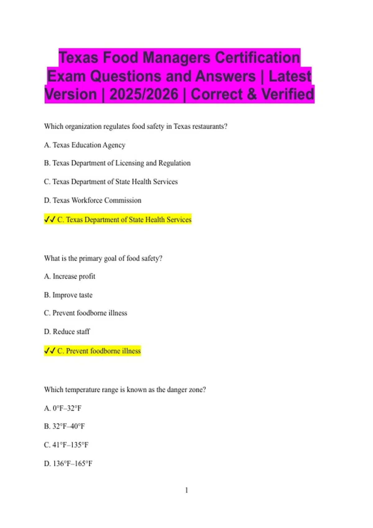 Texas Food Handlers Bundled Exams Questions and Answers Latest Versions (2025/2026) (Complete and Accurate)