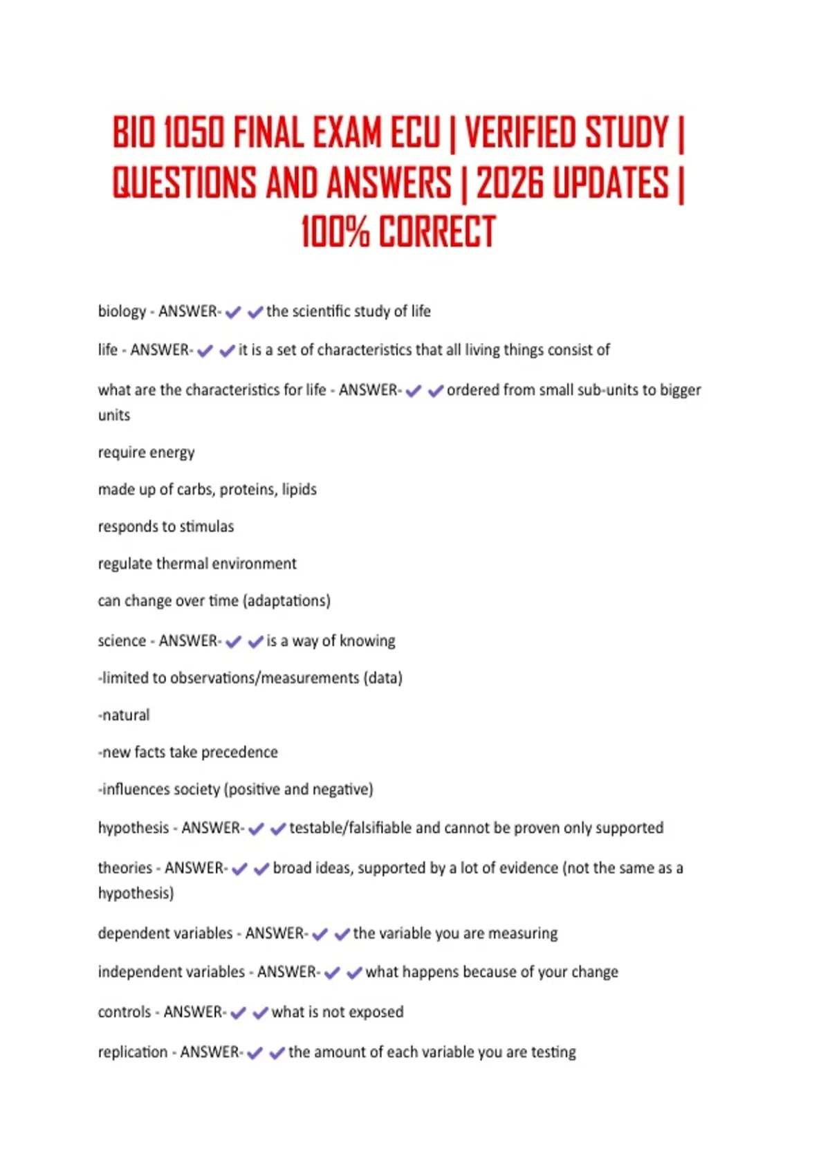 BIO 1050 FINAL EXAM ECU | VERIFIED STUDY | QUESTIONS AND ANSWERS | 2026 UPDATES | 100% CORRECT
