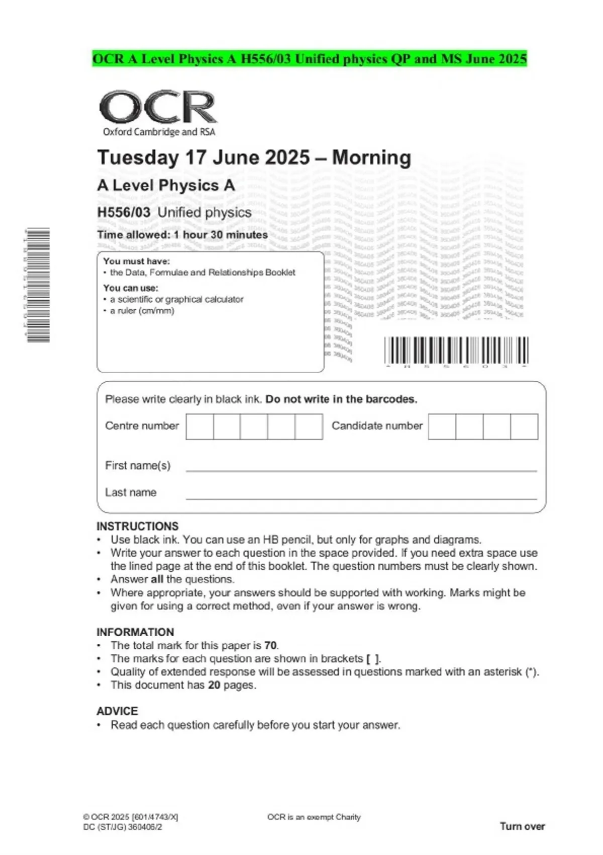 OCR A Level Physics A H556/03 Unified physics QP and MS June 2025