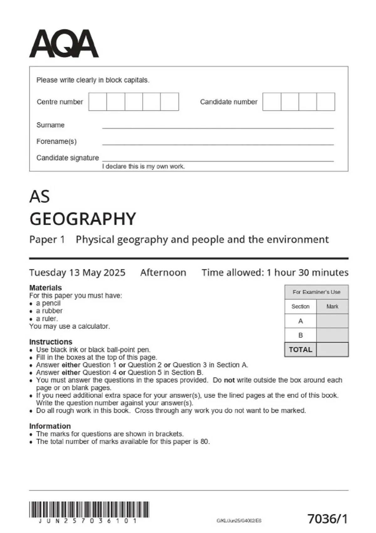 2025 AQA AS Geography 7036 ALL EXAMS WITH QUESTION PAPERS AND MARK SCHEMES