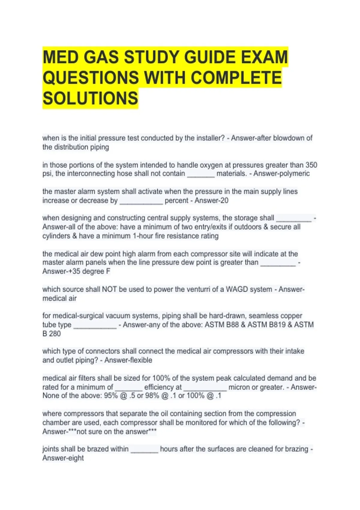 1 Exam (elaborations) MED GAS STUDY GUIDE EXAM QUESTIONS WITH COMPLETE SOLUTIONS 2 Exam (elaborations) MED GAS EXAM REVIEW QUESTIONS WITH 100% CORRECT ANSWERS 3 Exam (elaborations) MED GAS EXAM REPORTED QUESTIONS WITH 100% CERTIFIED ANSWERS 4 Exam (elaborations) MED GAS FINAL EXAM QUESTIONS WITH COMPLETE SOLUTIONS 5 Exam (elaborations) MED GAS