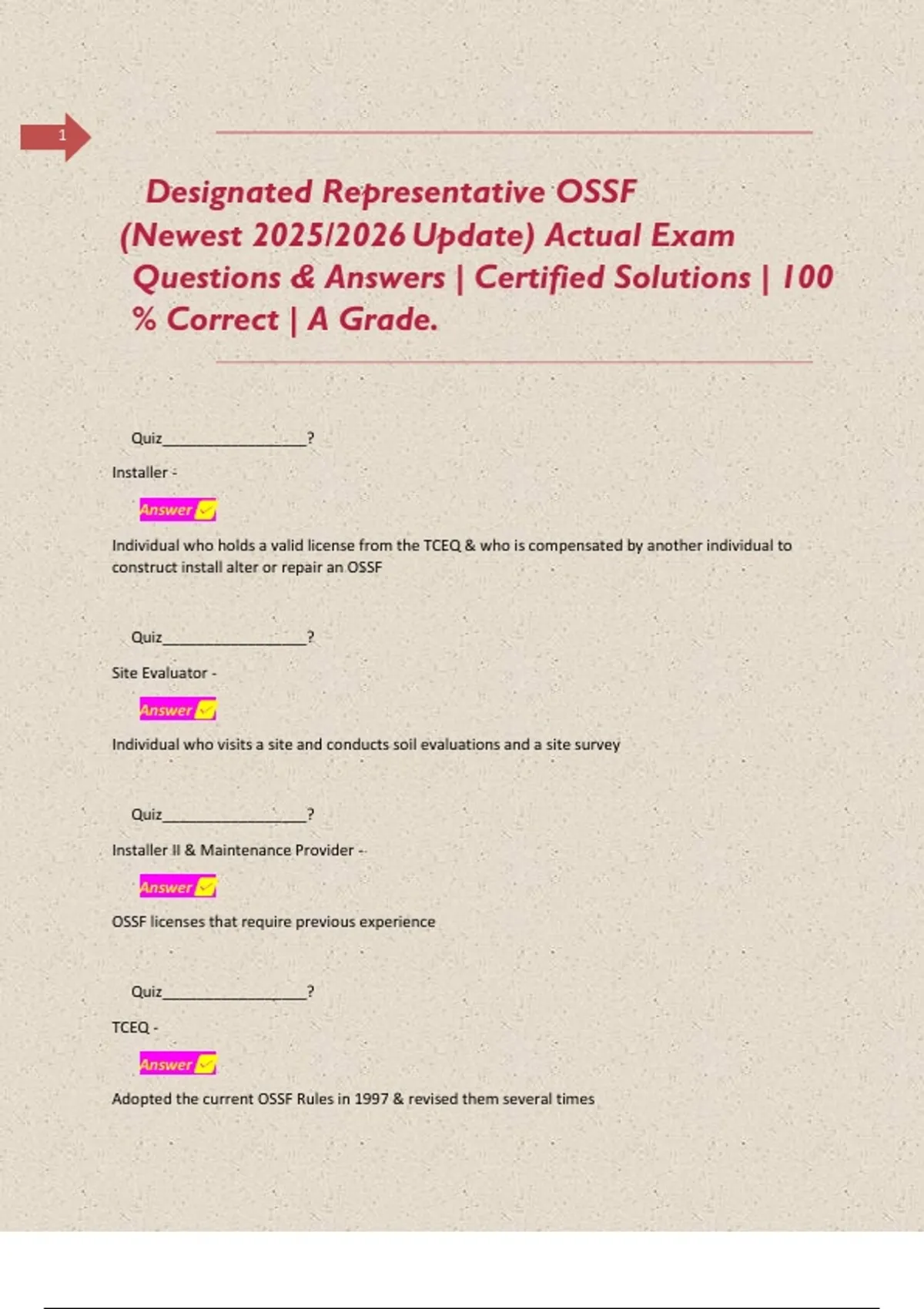 Designated Representative OSSF & OSSF Installer 1 Compilation BUNDLE (Newest 2025/2026 Update) Actual Exam Questions & Answers | Certified Solutions | 100 % Correct | A Grade