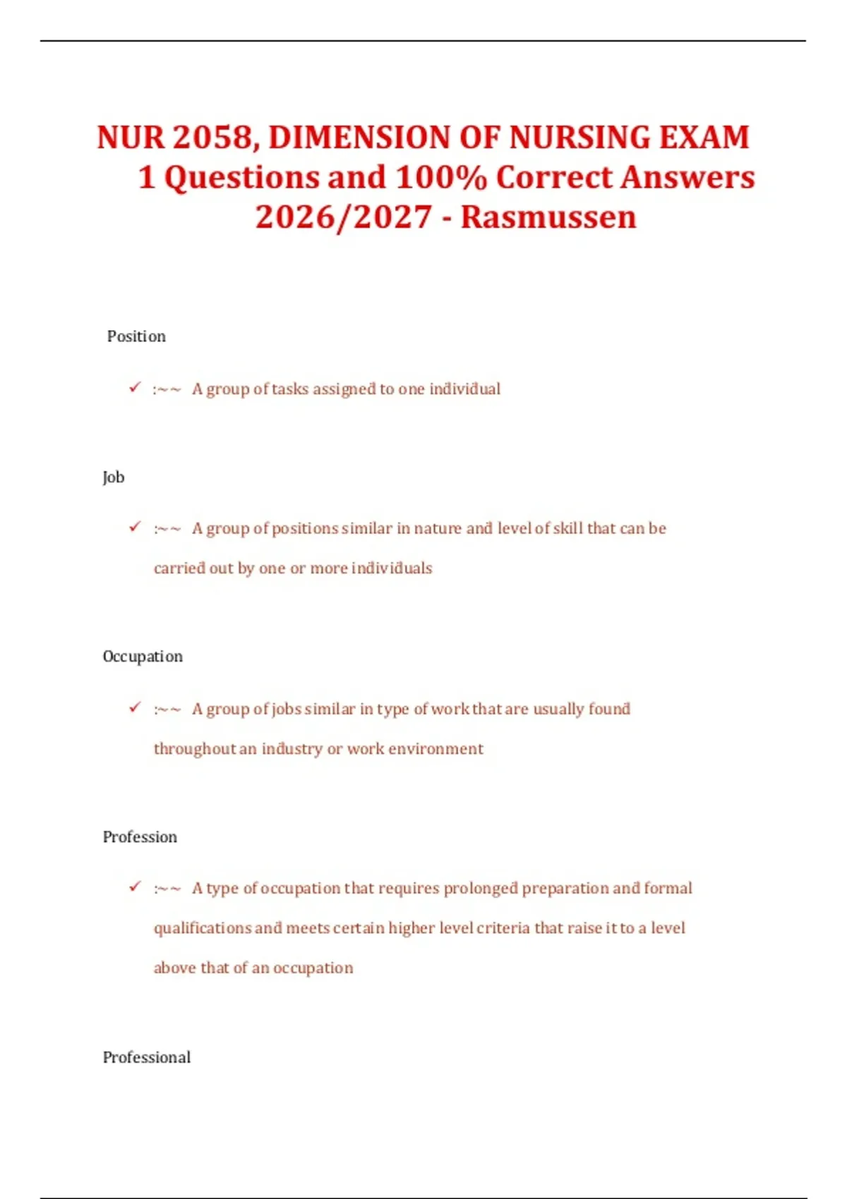 NUR 2058 Dimensions of Nursing Exam 1 – Questions and 100% Correct Answers – Rasmussen (2026/2027) NUR 2058 Dimensions of Nursing Practice Exam 2 – Study Guide Questions and Answers – Latest Updated (2026/2027) – Rasmussen NUR 2058 Dimensions of Nursing Practice – Final Exam Review Questions and Correct Answers – Rasmussen (Latest 2026/2027) NUR 20